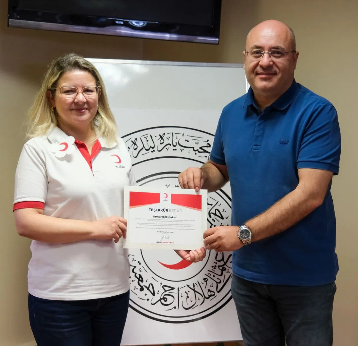 Türk Kızılay Kırklareli İl Merkezi Başkanlığı, Türkiye 2023 performans değerlendirmesinde ilk 10’a girerek büyük bir başarıya imza attı. Bu üstün başarının ödülü olarak, Türk Kızılay Genel Başkanı tarafından verilen Teşekkür Beratı, Yönetim Kurulu Üyesi Esra Özkoç tarafından Türk Kızılay Kırklareli İl Merkezi Başkanı Volkan Göç'e takdim edildi.