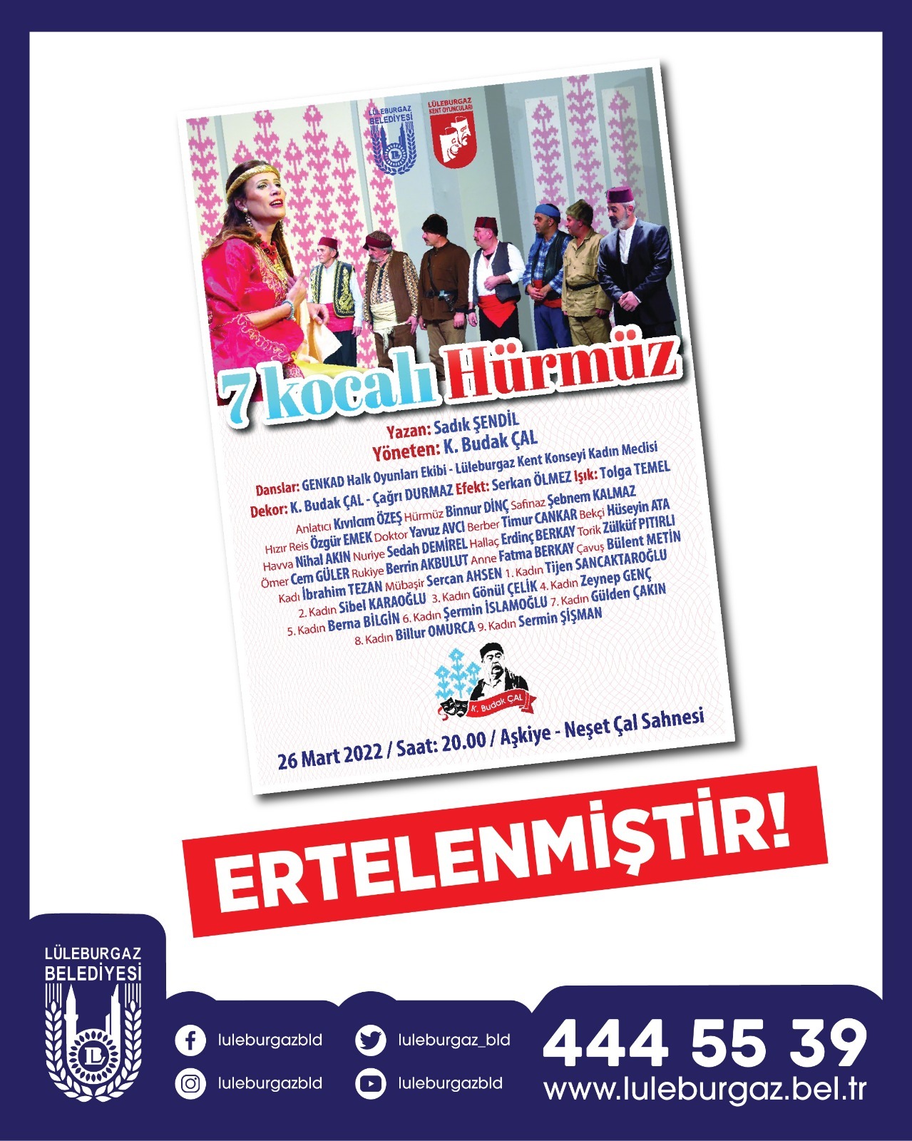 Lüleburgaz Belediyesi’nin düzenlediği Kerim Budak Çal Tiyatro Şenliği kapsamında 26 Mart Cumartesi günü oynanması planlanan 7 Kocalı Hürmüz oyunu, sağlık sorunları nedeniyle ileri bir tarihe ertelen