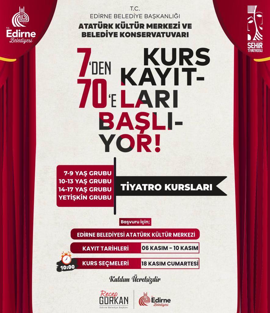 Edirne Belediyesi Şehir Tiyatrosu’nun düzenlediği “7’den 70’e Tiyatro Kurslarına” kayıtlar başladı. Büyük-küçük tüm tiyatroseverlerin sabırsızlıkla beklediği tiyatro kurslarının seçmeleri için tiyatroseverler, Edirne Belediyesi Atatürk Kültür Merkezi ve Belediye Konservatuvarı’na başvuruda bulunabilir.Geçtiğimiz yıl 29 Ekim Özel Gösterimi ile perdelerini açan Edirne Belediyesi Şehir Tiyatrosu, sadece ücretsiz gösterime sunduğu tiyatro oyunlarıyla değil 7’den 70’e verdiği ücretsiz tiyatro kursları ile de Edirnelilere hizmet vermeye devam ediyor.Geçtiğimiz yıl yoğun ilgi gören ve özlemle beklenen tiyatro kursları için ise yeni dönem kayıtları başladı. Tiyatro Kursuları 7-9 yaş, 10-13 yaş, 14-17 yaş grubu ile yetişkin grubu olarak 4 ayrı grupta düzenlenecek.. Tiyatroseverler, 10 Kasım Cuma Günü Saat:17.30’a kadar Atatürk Kültür Merkezi ve Belediye Konservatuvarı’na başvuruda bulunabilecek. Kurs seçmeleri ise 18 Kasım Cumartesi Edirne Belediyesi Atatürk Kültür Merkezi ve Belediye Konservatuarı’nda gerçekleştirilecek.