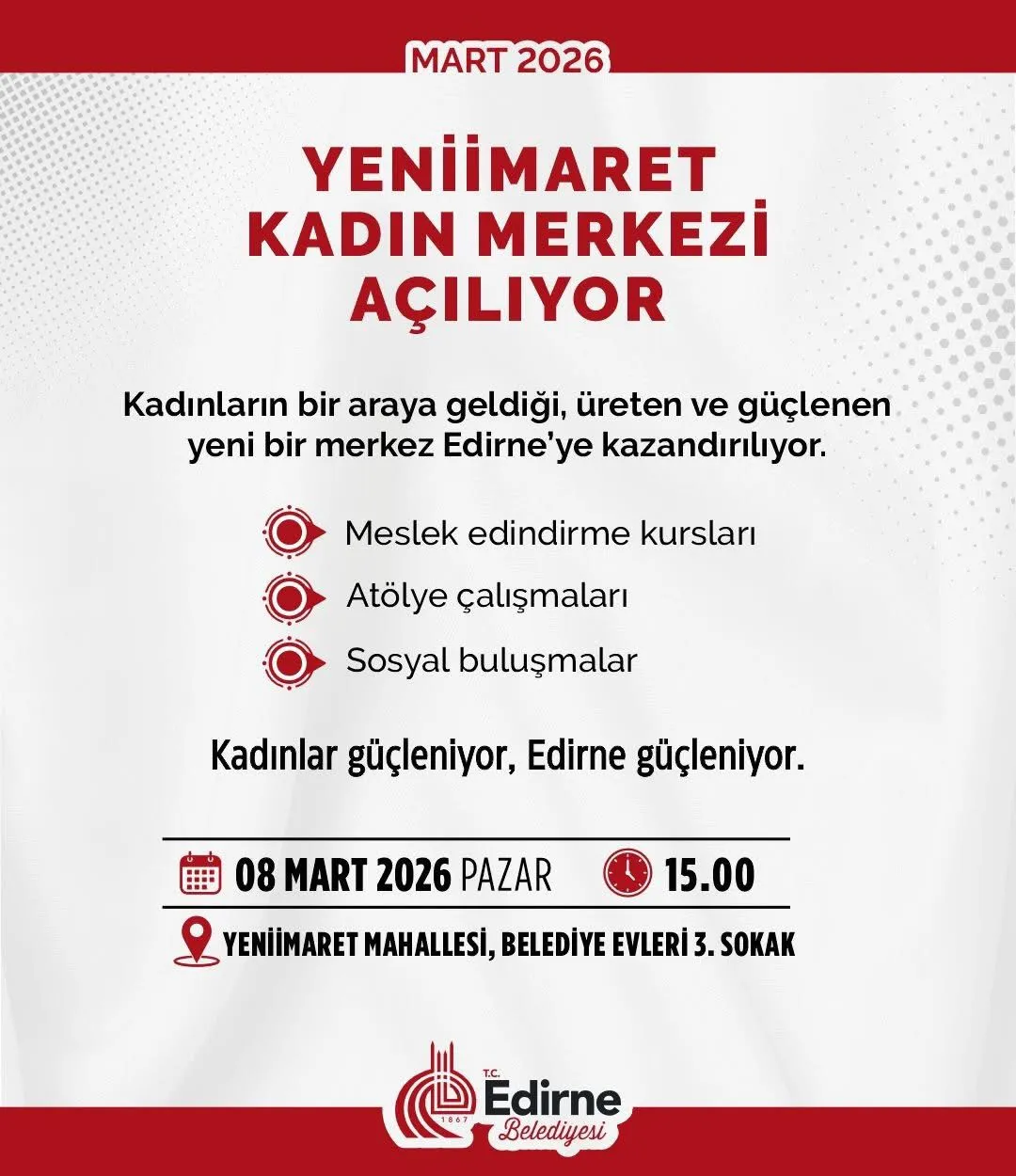 Edirne Belediyesi tarafından Yeniimaret Mahallesi’nde yapımı tamamlanan Yeniimaret Kadın Merkezi, 8 Mart Dünya Emekçi Kadınlar Günü’nde hizmete açılacak. Kadınların sosyal yaşamda daha aktif rol almasını amaçlayan merkezde meslek edindirme kursları, üretim atölyeleri ve çeşitli sosyal etkinlikler düzenlenecek.