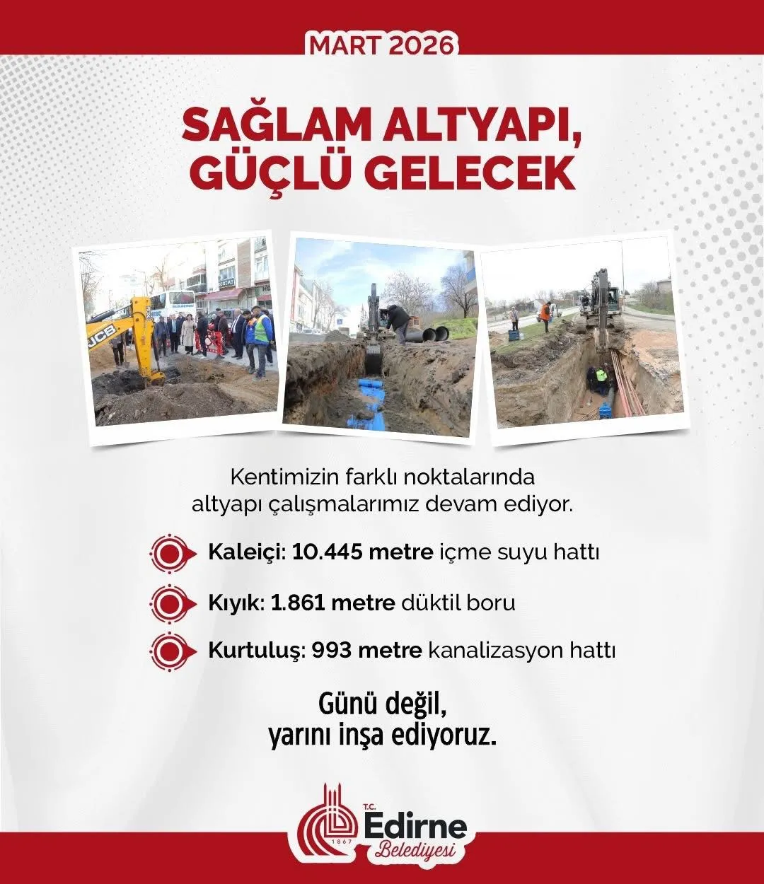 Belediye ekipleri bir yandan sosyal projeleri hayata geçirirken diğer yandan kent genelinde altyapı çalışmalarını sürdürüyor. Kaleiçi, Kıyık Mahallesi ve Kurtuluş Mahallesi’nde içme suyu ve kanalizasyon hatlarına yönelik çalışmalar devam ediyor. Ayrıca Kıyık Caddesi’nde yapılacak düzenlemelerle bölgenin daha modern ve düzenli bir görünüme kavuşması planlanıyor.