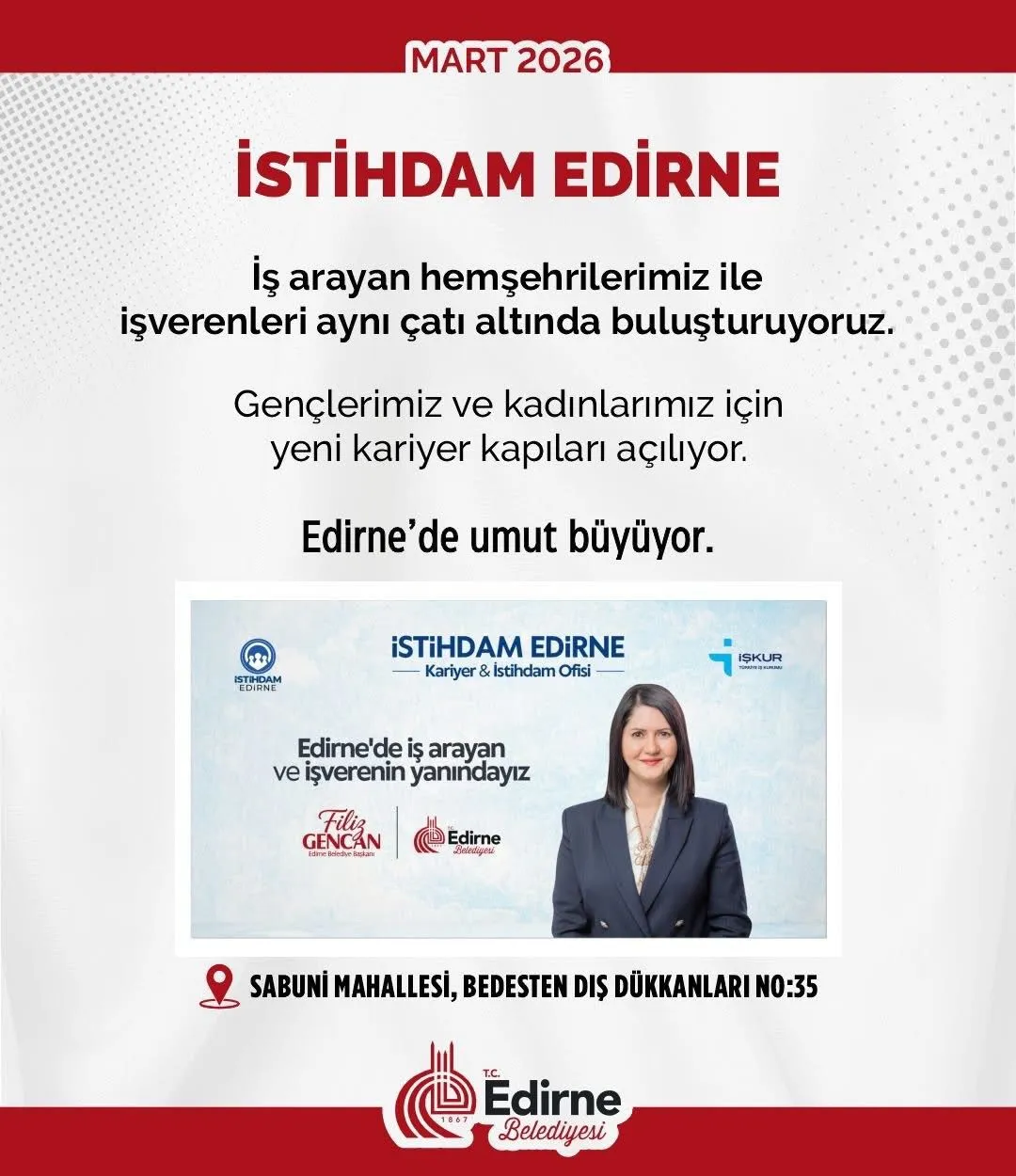 Edirne Belediyesi’nin iş arayan vatandaşlarla işverenleri buluşturmak amacıyla hayata geçirdiği “İstihdam Edirne” uygulaması da kentte dikkat çeken projeler arasında yer alıyor. Platform sayesinde özellikle gençler ve kadınlar için yeni iş fırsatlarının oluşturulması amaçlanırken, yerel ekonomiye de katkı sağlanması hedefleniyor.