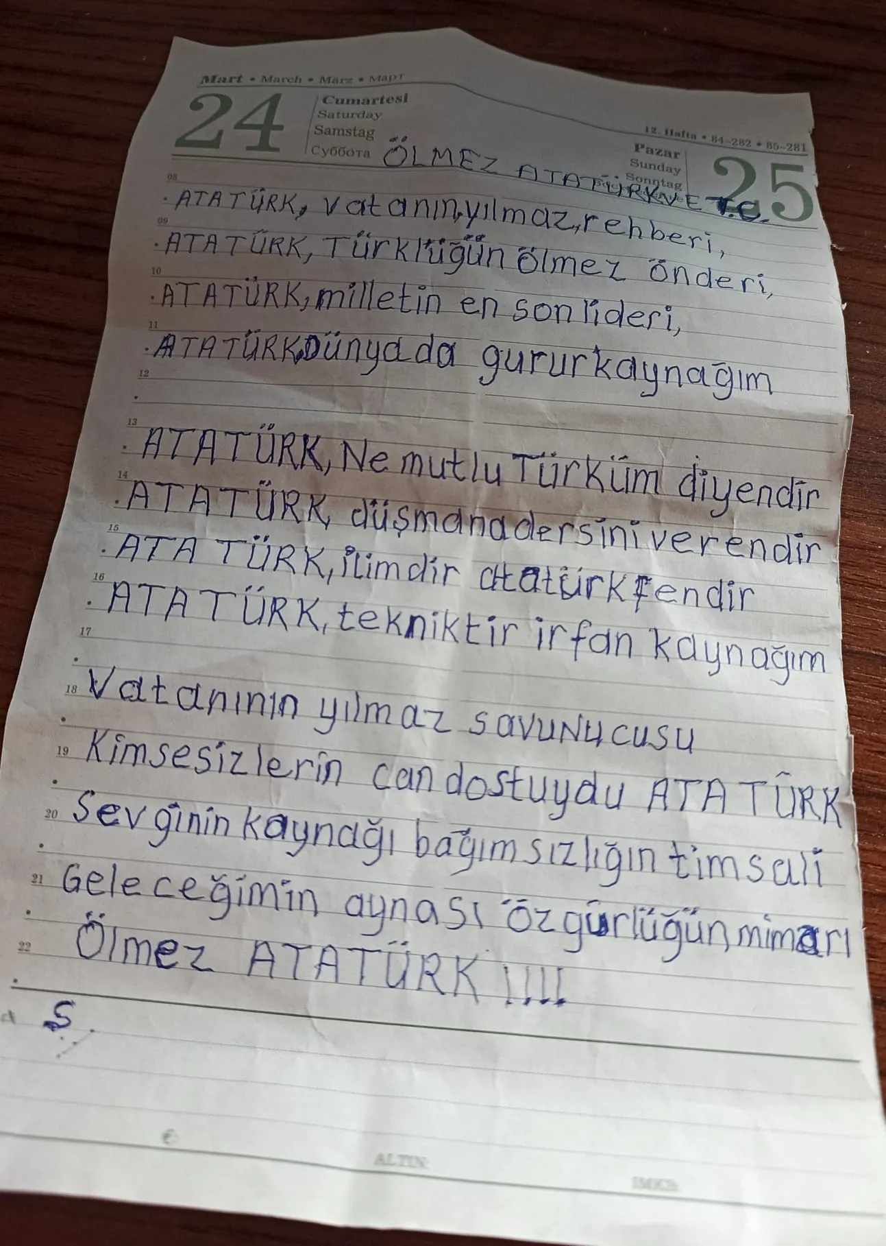 Kırklareli’nde yaşayan 91 yaşındaki Binnaz Töge, Cumhuriyetimizin 102. yılı kutlamalarında duygusal bir sürprize imza attı. Cumhuriyet sevdalısı Töge, Gazi Mustafa Kemal Atatürk’e ve Türkiye Cumhuriyeti’ne duyduğu sonsuz sevgi ve minnettarlığı kendi el yazısıyla kaleme aldığı şiirle dile getirdi.