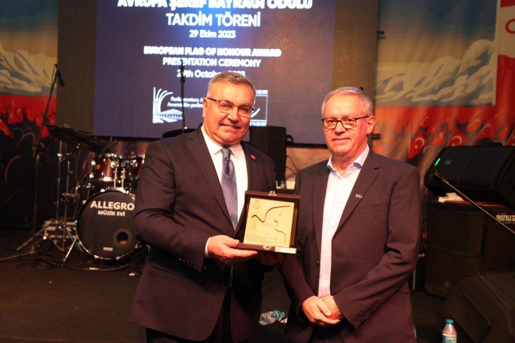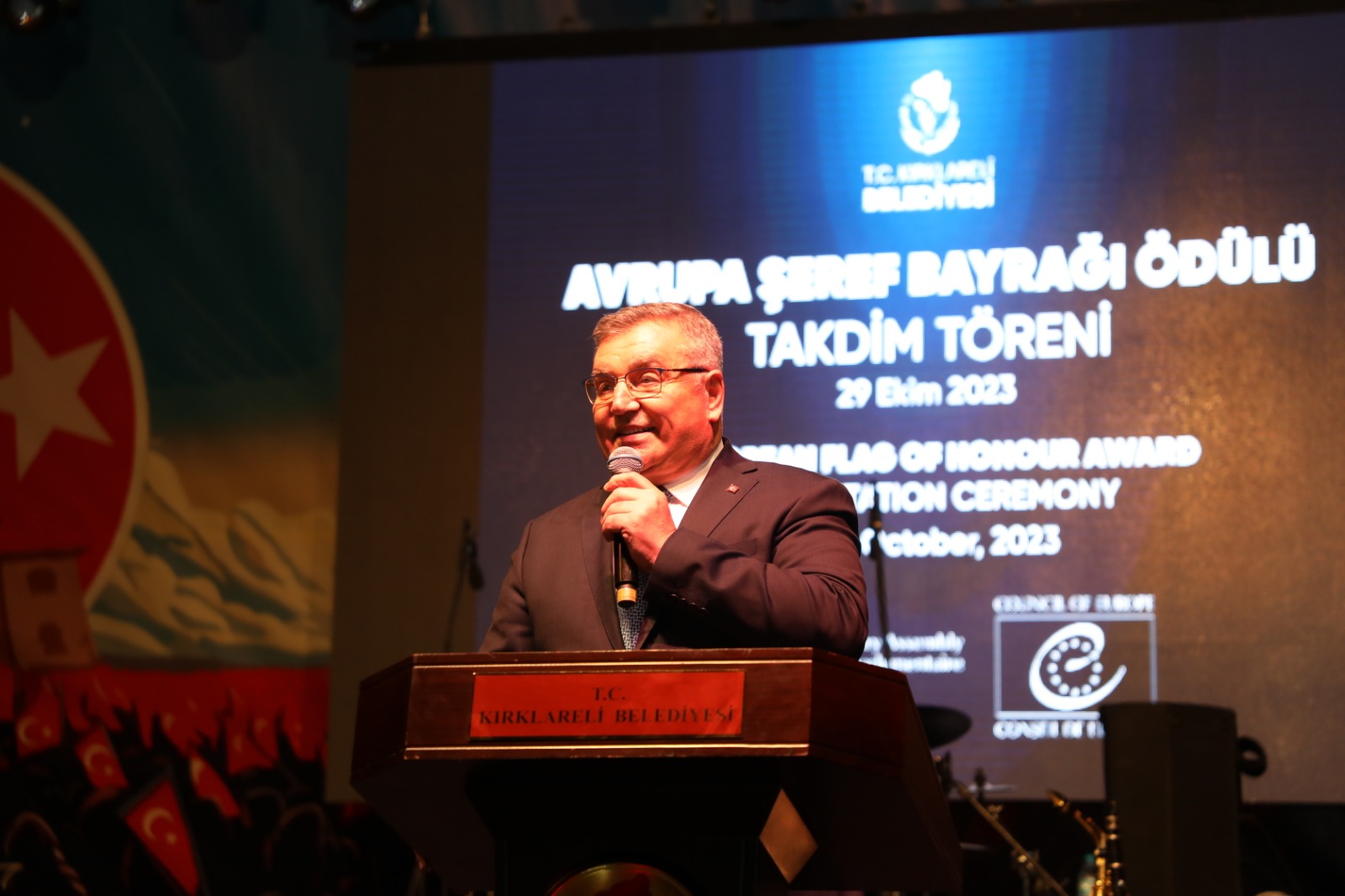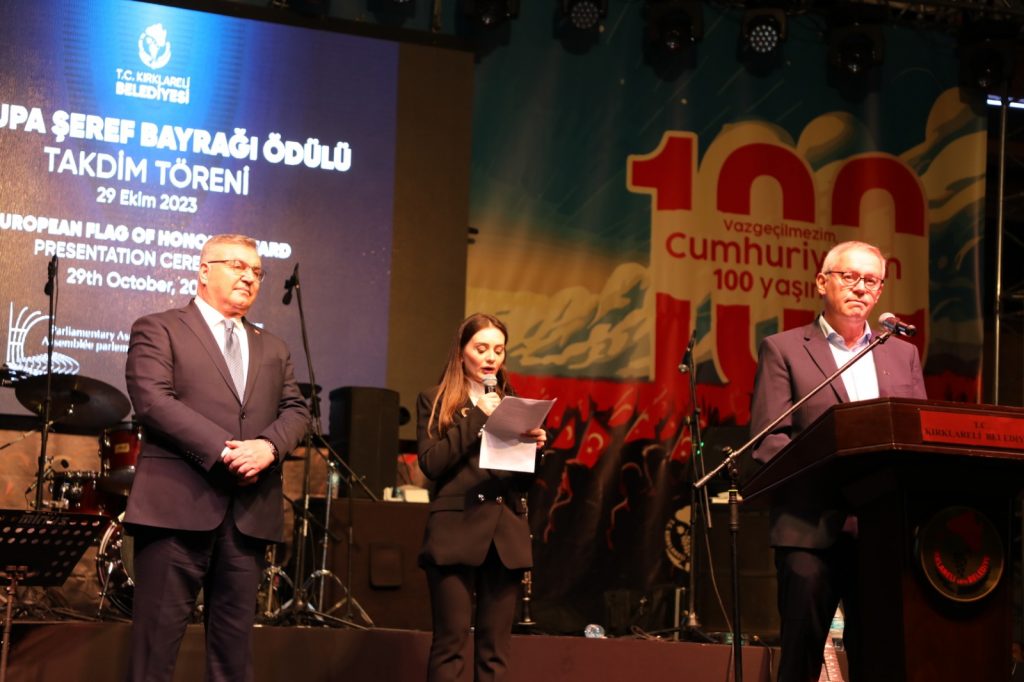 “Avrupa Şeref Plaketi”Belediye Başkanı Mehmet Siyam Kesimoğlu önderliğinde, adını sadece Türkiye’de değil, yurtdışında da duyuran Kırklareli Belediyesi, 12 yıldızlı şehir ünvanı ve Avrupa diplomasının ardından, Avrupa Şeref bayrağı ile de ödüllendirildi. Çağdaş uygarlığın temsilcisi Kırklareli halkı ile birlikte geleceğe güçlü adımlarla ilerlediklerini ifade eden Belediye Başkanı Mehmet Siyam Kesimoğlu, yeni hedeflerinin Avrupa Şeref Plaketi olduğunu söyledi. Cumhuriyet’in 100. Yılında, şeref bayrağını, Kesimoğlu’na takdim eden İsviçre’li parlamenter Pierre-Alain Fridez’de, Kırklareli’nin bu yolda çok şanslı ve kararlı olduğunu ifade etTİ..Kırklareli Belediyesi Avrupa’dan 2018 yılında 12 yıldızlı şehir ödülü, 2020 ve 2022 yıllarında Avrupa Yerel Demokrasi ödülü, 2021 yılında da Avrupa Diploması kazanmıştı. Cumhuriyet’in 100. Yılında, Avrupa Şeref Bayrağını ödülüne hak kazanan Kırklareli’nin yeni hedefi, bu yoldaki yeni aşama olan Avrupa Şeref Plaketi. Ardından ise en yüksek nişan olan Avrupa Ödülü.Fridez; “Kırklareli’nin kararlılığına hayranız”Avrupa Şeref Bayrağı ödülüne, Avrupa Konseyi Parlamenterler Meclisi, Sosyal İşler, Sağlık ve Sürdürülebilir Kalkınma Komitesi tarafından layık görülen Kırklareli’nin Avrupa Birliği gerekliliklerine bağlılığını takdir eden ve aynı zamanda ödülü, Belediye Başkanı Mehmet Siyam Kesimoğlu’na takdim eden İsviçre’li parlamenter Pierre-Alain Fridez, şeref bayrağının Avrupa Ödülü’nün ikinci nişanı olduğunu kaydederek; “Kırklareli’nin çabalarından çok etkilendiğimizi söylemek istiyorum. Kırklareli aynı zamanda bir dayanışma kentidir. Doğal afetlerdeki kolektif girişimleri, pandemi dönemindeki çalışmaları bunlardan sadece bazılarıdır. Bu şeref bayrağını vatandaşlarınıza yönelik Avrupa faaliyetlerinizin ve Avrupa’ya olan bağlılığınızın bir ödülü olarak, aynı zamanda bunları gelecekte geliştirmeye devam etmek için bir teşvik olarak düşünün. Sizi bir sonraki ödül olan Avrupa Konseyi şeref plaketi için yapılan yarışmaya davet ediyorum. Çabalarınızın karşılığını en kısa sürede alacağınızı umuyorum. Kırklareli’nin Avrupa ödülünü kazanma yolunda attığı kararlı adımlara hayranız. Çok yaşa Kırklareli” dedi.Kırklareli Belediye Başkanı Mehmet Siyam Kesimoğlu da, Kırklareli’yi uluslararası boyutlara taşımanın haklı gururu içerisinde olduklarını ifade ederek şunları söyledi:Kesimoğlu; “Bu ödül, Kırklareli’nin dünyada fark edilme başarısıdır”“2018 yılında 12 yıldızlı şehir ödülünü, 2021 ve 2022 yıllarında Avrupa diploması ödüllerini şehrimize getirdik. Ve şimdi ödüllerin en büyüğü Avrupa Şeref Bayrağı’nı kazandık. Bu sadece benim ve Kırklareli Belediyesi’nin değil, hepimizin başarısıdır. Kırklareli halkının dayanışma duygusu içerisinde bu ödülü almaya hak kazandık. Bu ödül dünya tarafından Türkiye’nin ve Kırklareli’ni fark edildiği, takdir edildiği bir başarıdır. Bu ödül de azmimize, gücümüze güç katacaktır. Şeref bayrağı ödülünü, Cumhuriyetimizin 100. kuruluş yıldönümünde, bize bu vatanı ve Cumhuriyeti armağan eden Atatürk’e ve mücadele arkadaşlarına ithaf ediyorum.”İlerleyen süreçte hedeflerinin şeref plaketi ve en yüksek nişan olan Avrupa Ödülü olduğunu belirten Başkan Kesimoğlu sözlerini söyle sürdürdü:“Yeni hedeflere, yine halkımızla ulaşacağız”“Bugüne kadar yaptığımız çalışmalar ve attığımız adımlarla, Kırklareli’yi bir marka haline getirdik ve sınırları aşan bir statüye kavuşturduk. Daha önce de belirtmiştim. Bizler tüm vizyon ve gayemizle yüzümüzü batıya döndük. Mustafa Kemal Atatürk’ün izinden, çağdaşlığın en ileri seviyesine ulaşmak için hızla koşuyoruz. Bundan sonra da, yapacağımız yeni çalışmalar, atacağımız yeni adımlarla, yepyeni başarıları halkımıza armağan edeceğiz. Avrupa yolundaki yeni hedeflerimize de, aydınlık yüzlü insanlarımızla ulaşacağımızı biliyorum.”
