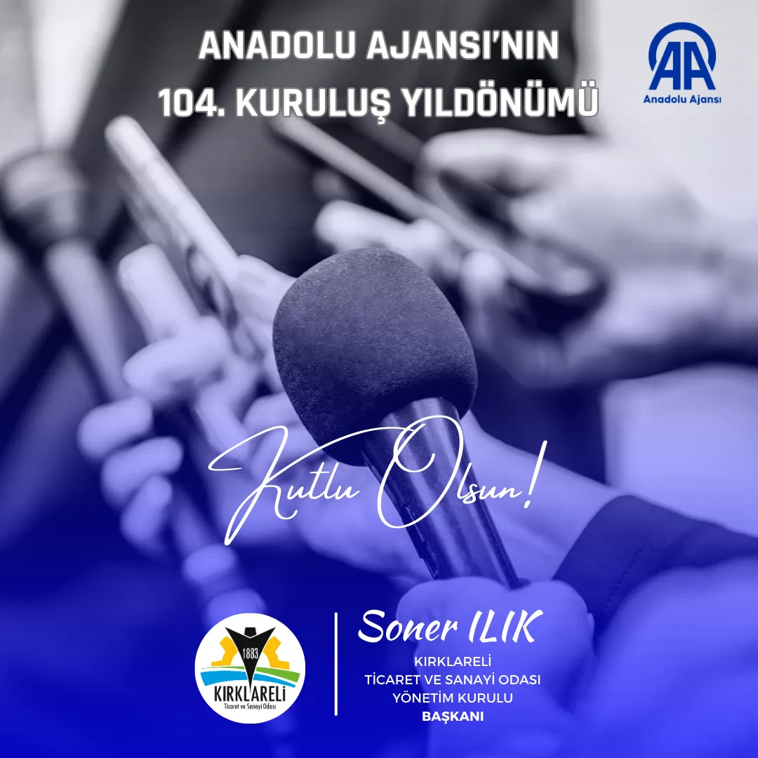Kırklareli Ticaret ve Sanayi Odası (Kırklareli TSO) Yönetim Kurulu Başkanı Soner Ilık, Anadolu Ajansı’nın (AA) 104. Kuruluş Yıldönümü dolayısıyla önemli açıklamalarda bulundu. Ilık, AA'nın ülkemizin sesi olarak büyük bir ilerleme sağladığını ve habercilik alanında güvenilir bir kaynak olduğunu vurguladı. 6 Nisan 1920'de kurulan AA'nın, uluslararası standartlara bağlı kalarak objektif haberleri geniş bir dil yelpazesiyle sunmasıyla önemli bir hizmet verdiğini belirtti.