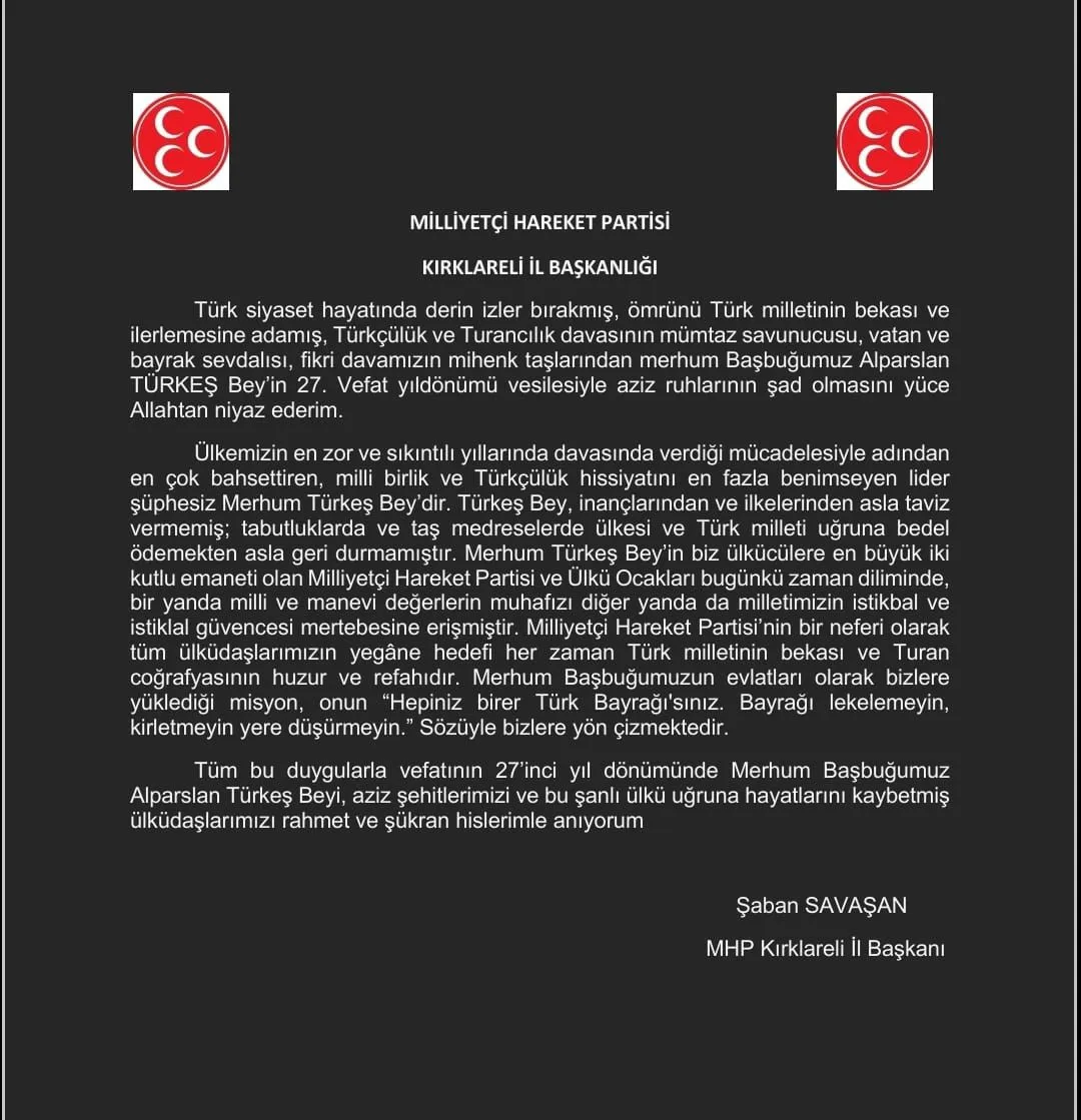 Milliyetçi Hareket Partisi (MHP) Kırklareli İl Başkanı Şaban Savaşan, Türk siyasetine damgasını vuran isimlerden Başbuğ Alparslan Türkeş'in 27. vefat yıldönümü dolayısıyla önemli açıklamalarda bulundu. Başkan Savaşan'ın ifadelerine göre Türkeş Bey, Türk siyasetine derin izler bırakan, Türk milletinin bekası ve ilerlemesi için ömrünü adayan, Türkçülük ve Turancılık davasının önde gelen savunucusu olarak biliniyor.