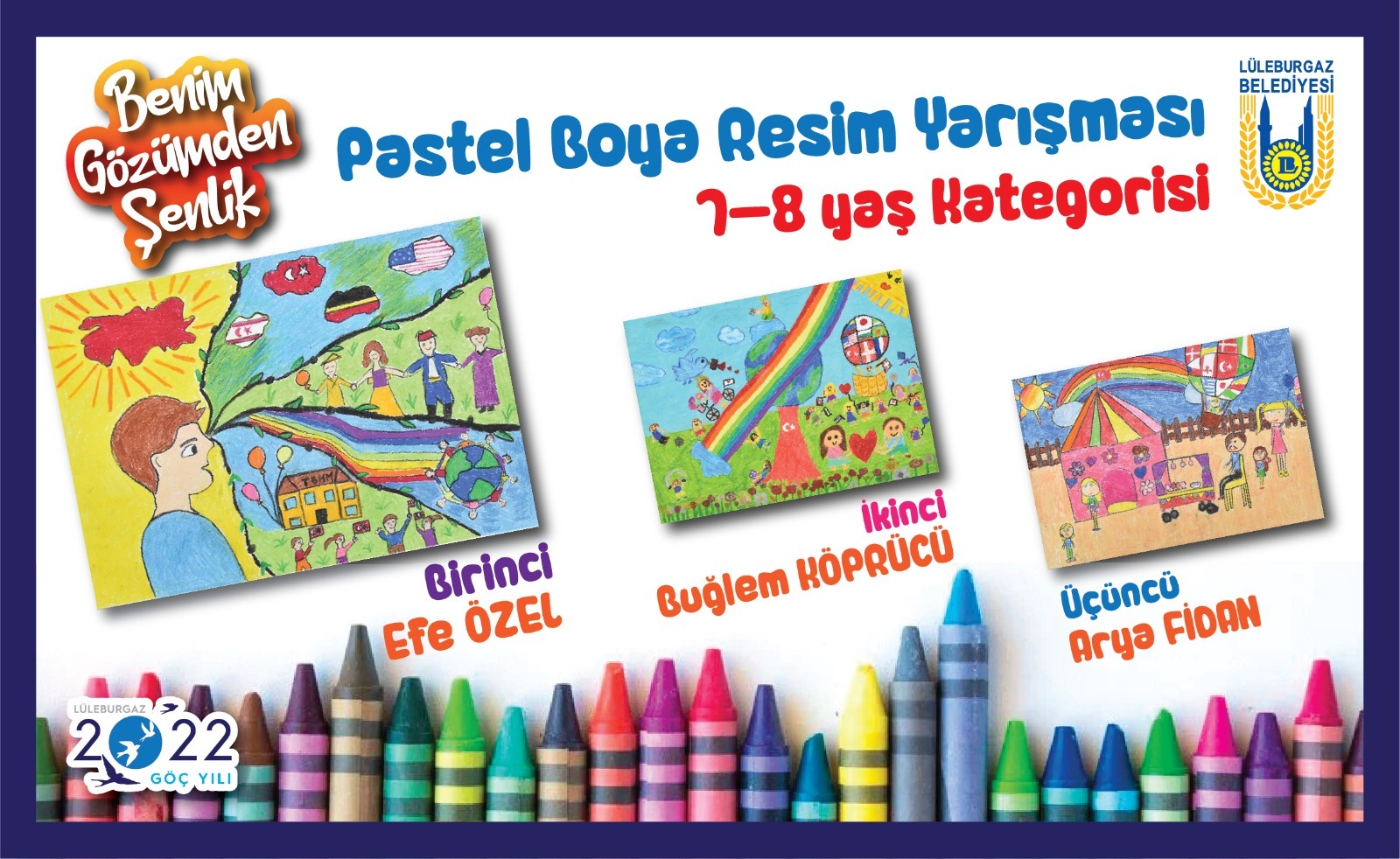 Lüleburgaz Belediyesi’nin 31. Uluslararası 23 Nisan Çocuk Şenliği afiş tasarımı için düzenlediği “Benim Gözümden Şenlik” Pastel Boya Resim Yarışması sonuçlandı. Lüleburgaz Belediyesi’nin 31. Uluslararası 23 Nisan Çocuk Şenliği afiş tasarımı için “Benim Gözümden Şenlik” Pastel Boya Resim Yarışması sona erdi. Toplam 5 ayrı kategoride 5 ile 14 yaş arasındaki çocukların katılabildiği yarışmada dereceye giren çocuklara sürpriz ödül verilecek. Yarışmada birinci olan eserler 31. Uluslararası 23 Nisan Çocuk Şenliği’nde afiş olarak yer alacak. Dereceye girenlerin listesi Benim Gözümden Şenlik Pastel Boya Resim Yarışması’nda dereceye giren çocuklar ve kategorileri şöyle; 5-6 Yaş Kategorisi1-Mutlu Aras TOPRAK2-Hazal AYSAN3-Kıvanç CANATAN 7-8Yaş Kategorisi1-Efe ÖZEL2-Buğlem KÖPRÜCÜ3-Arya FİDAN9-11 Yaş Kategorisi1-Bade Öykü KIYGA2-Derin DİNÇER3-Ela ÇELİK 12-14 Yaş Kategorisi1-Duru TOPRAK2-Melek Elzem CANO3-Eyyüp AYDIN Jüri Özel ÖdülüSuna KARAKAŞ