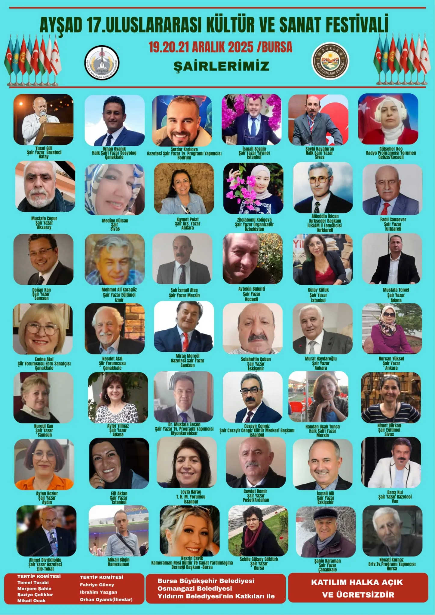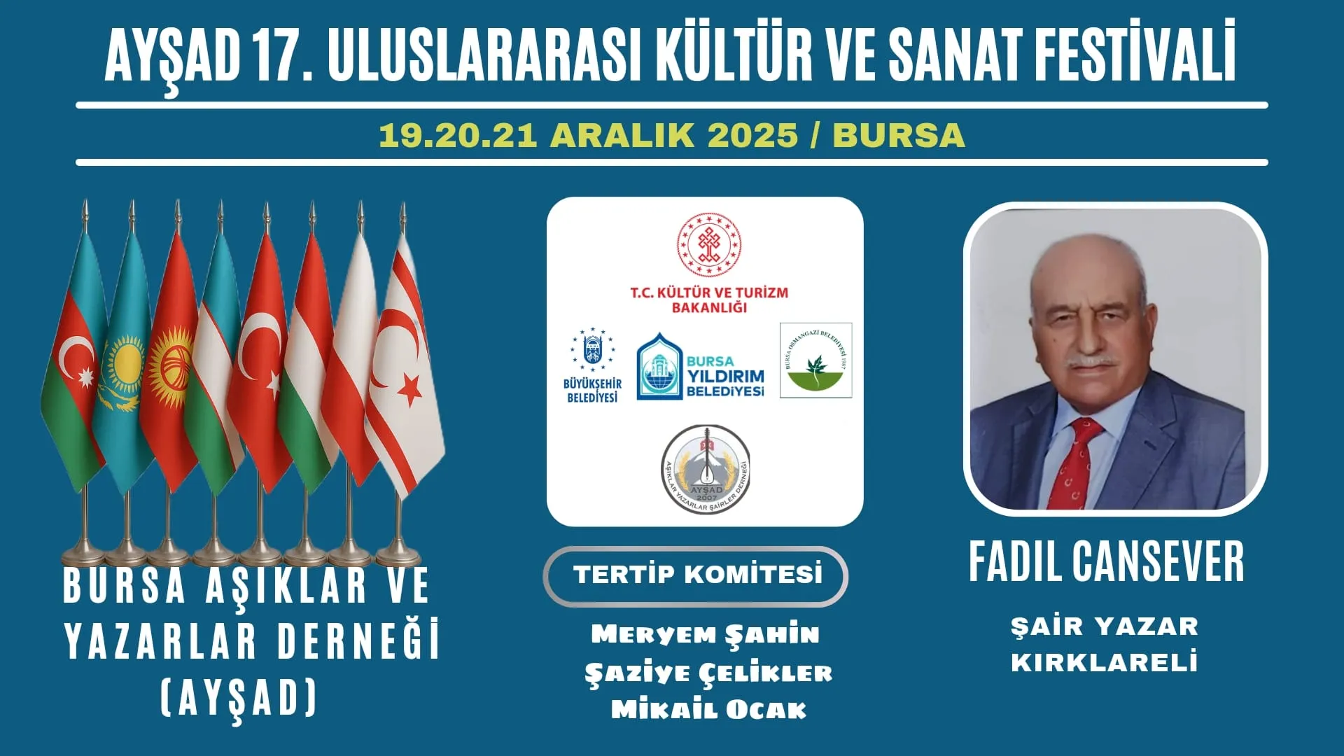 Bursa Âşıklar Yazarlar Şairler Derneği (AYŞAD) tarafından bu yıl 17’ncisi düzenlenecek Uluslararası Kültür ve Sanat Festivali, 19–21 Aralık 2025 tarihleri arasında Bursa’da gerçekleştirilecek. Türkiye’nin dört bir yanından sanatçıları buluşturacak festivalde Kırklareli’nden katılımın güçlü olması dikkat çekiyor.