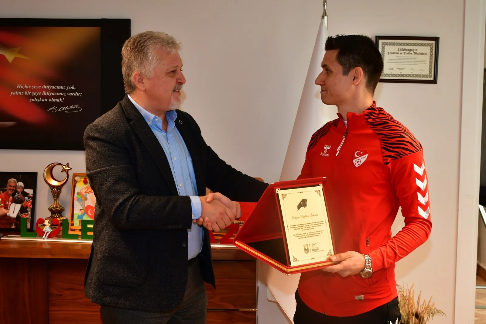 Düzce’de oynanan Düzcespor–Çayelispor karşılaşmasında tribünde fenalaşan bir taraftar için maçı durdurup sağlık ekiplerini yönlendiren Lüleburgazlı hakem Ceyhun Elmas, duyarlılığıyla Türkiye’nin takdirini kazandı. Olayın ardından Elmas, Lüleburgaz Belediye Başkanı Dr. Murat Gerenli’yi ziyaret etti. Başkan Gerenli, gösterdiği insani refleks nedeniyle Elmas’a plaket takdim etti.