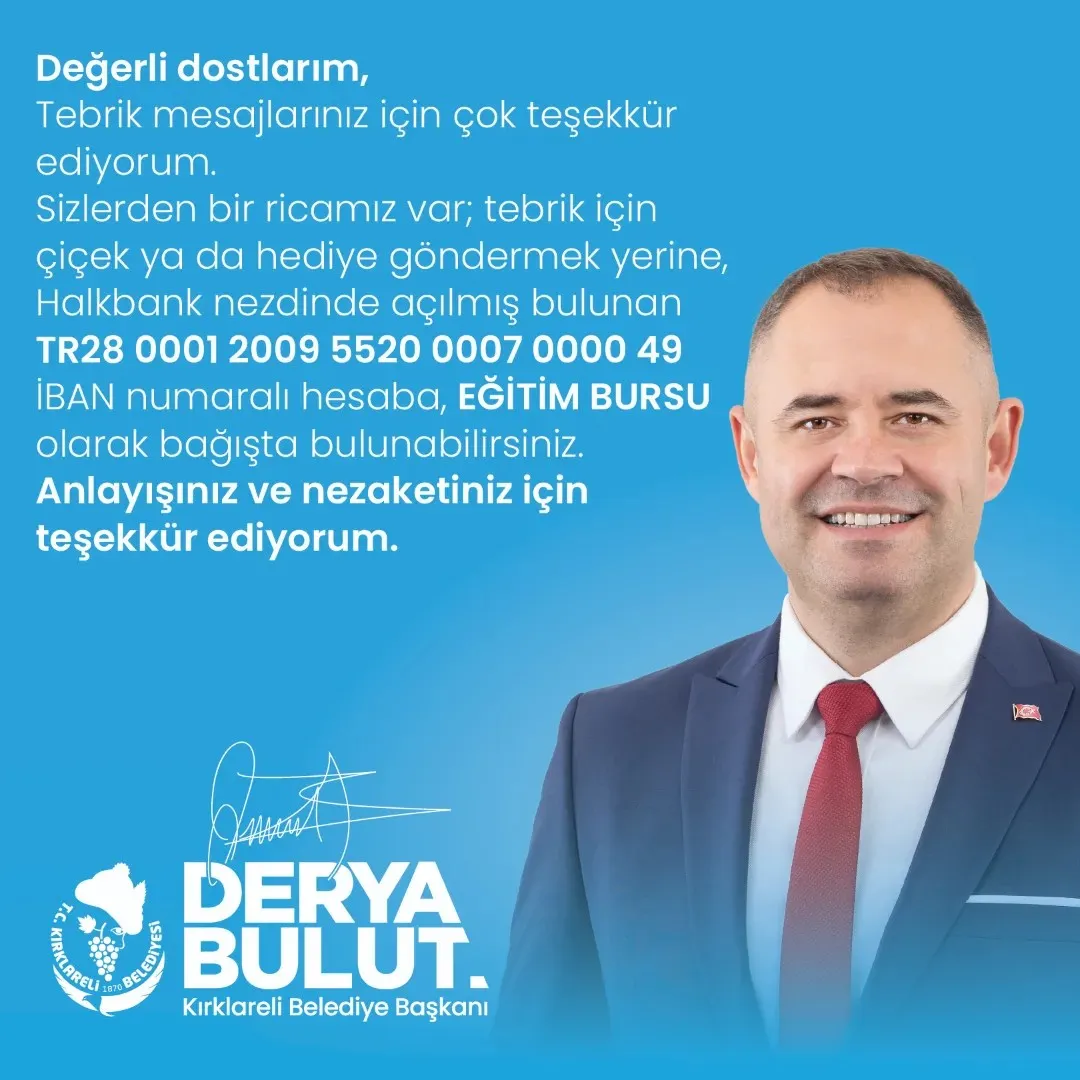 Kırklareli'nin yeni Belediye Başkanı Derya Bulut, 31 Mart Yerel Seçimlerinde aldığı zaferin ardından tebrikleri kabul etmek için özel bir istekte bulundu. Bulut, kendisine gönderilecek çiçek ve hediyelerin yerine eğitim bursu olarak bağışlanmasını istedi.
