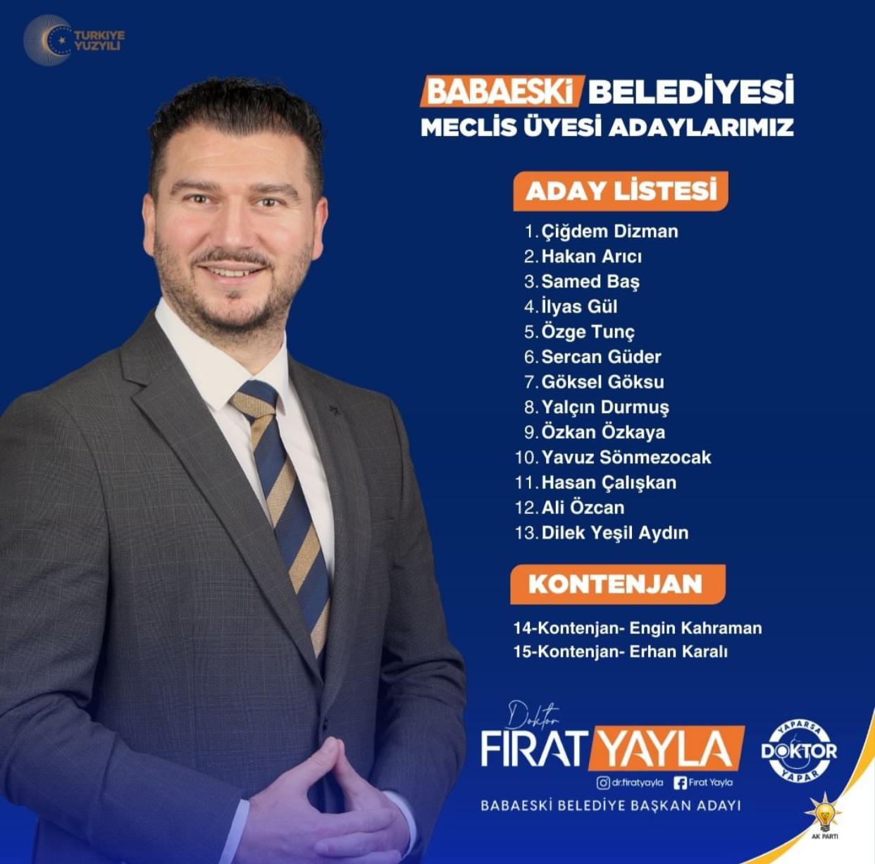 Ak Parti'nin Babaeski Belediye Başkanı Adayı Dr. Fırat Yayla, "Babaeski'mizin samimi, sıcak ve gözlerinin içi gülen bütün sakinleriyle birlikte; ilçemizin daha güzel yarınlara kavuşması için çalışmaya devam edeceğiz" diyerek Babaeski'nin geleceğini şekillendireceklerini vurguluyor. Babaeski için daha yaşanılabilir bir ortam oluşturmak amacıyla adaylığını koyan Yayla, halkın desteğini ve güvenini beklediğini söylüyor. Aynı zamanda Babaeski'nin geleceğini şekillendirecek meclis üyesi adaylarını da tanıtarak birlikte daha güçlü ve başarılı olacaklarına olan inancını dile getiriyor.
