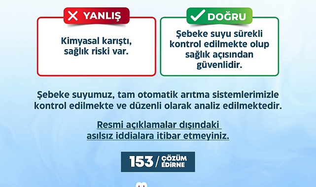 Belediye tarafından yapılan açıklamada, Edirnelilerin musluk suyunu gönül rahatlığıyla içebileceği vurgulandı. Şehre verilen içme suyunda insan sağlığını tehdit eden bir unsur bulunmadığı, kamuoyunda oluşturulmak istenen endişenin gerçeğe dayanmadığı belirtildi.