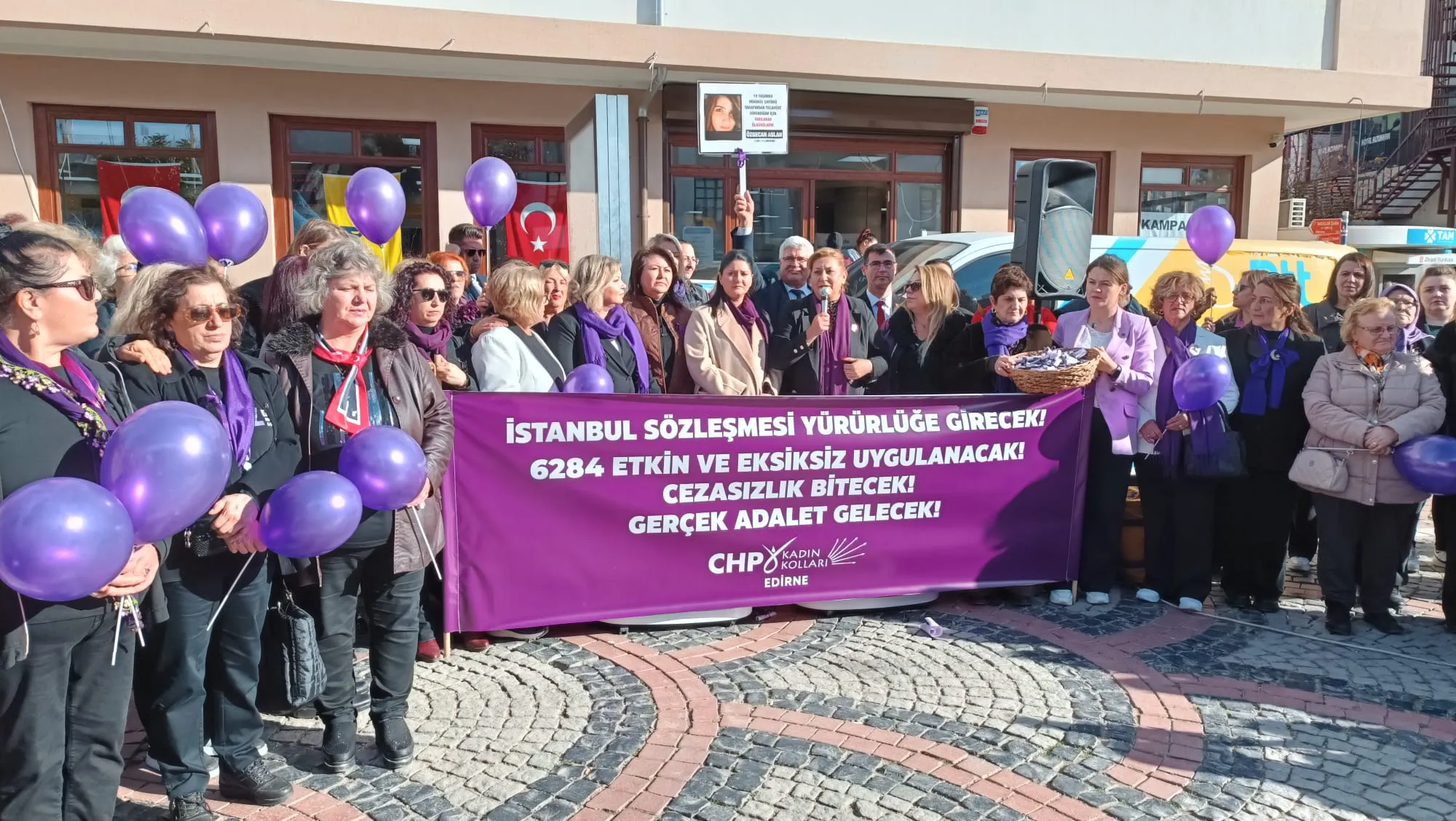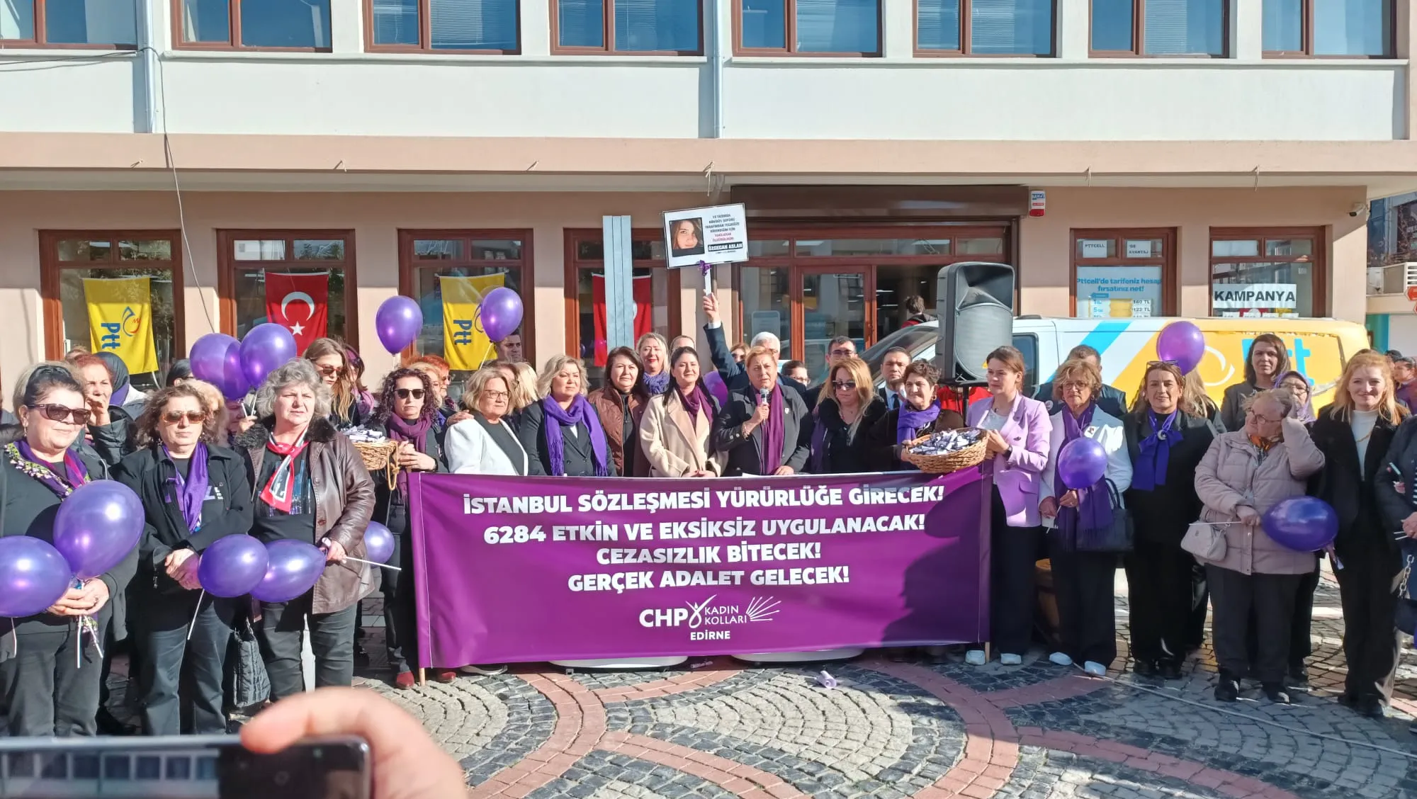 Edirne’deki basın açıklaması, Saraçlar Caddesi PTT önü meydanında geniş bir katılımla gerçekleşti. CHP Kadın Kolları üyeleri, sivil toplum temsilcileri ve çok sayıda vatandaşın yer aldığı etkinlikte açıklamayı İl Temsilcisi Çiğdem Gegeoğlu okudu. Alanı dolduran kalabalık, kadın mücadelesine destek veren sloganlarla açıklamaya eşlik etti.