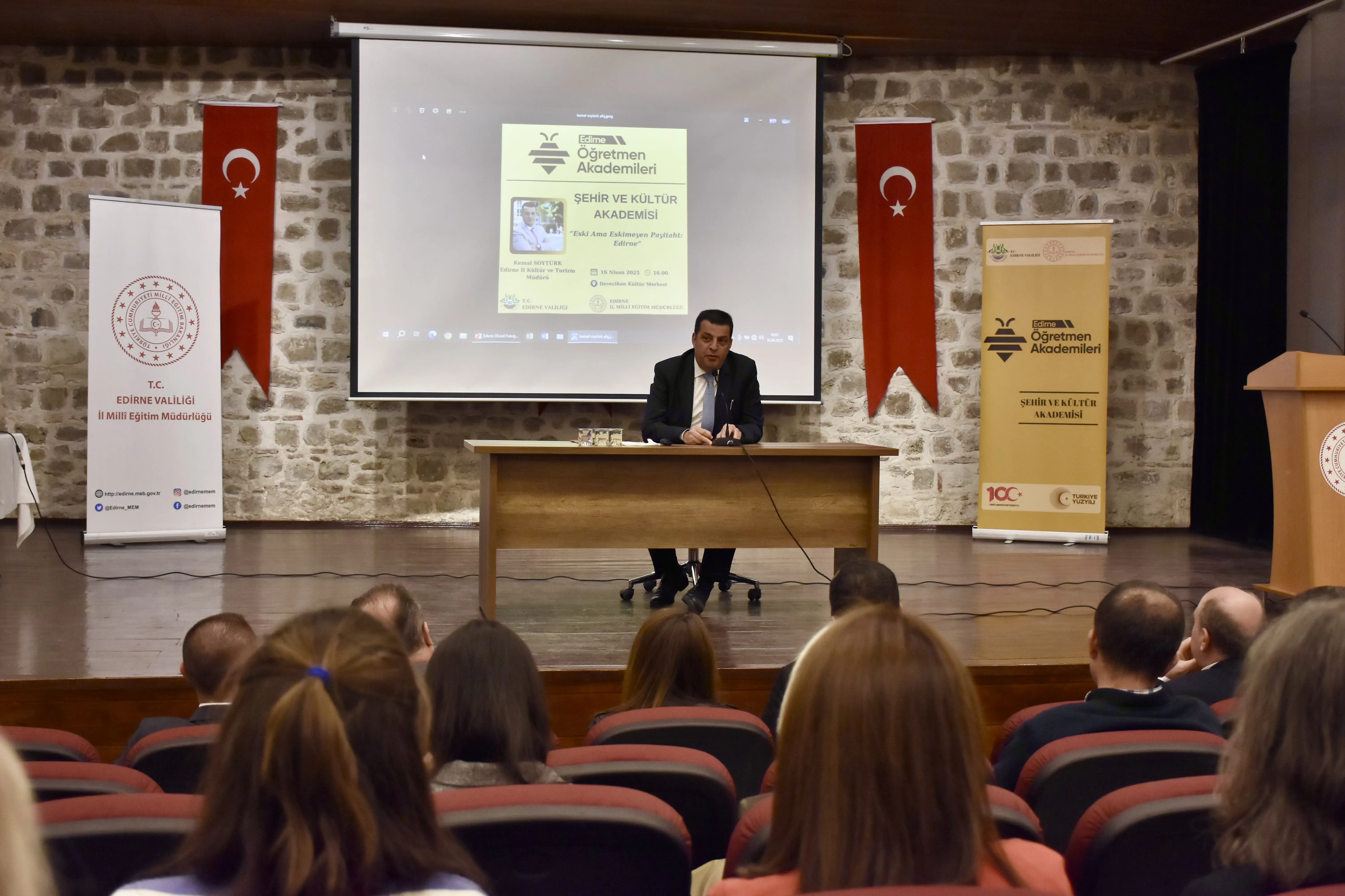 Edirne İl Milli Eğitim Müdürlüğü tarafından yürütülen Edirne Şehir ve Kültür Akademisi buluşmaları, şehrin kültürel mirasını tanıtmayı sürdürüyor. Bu kapsamda, 16 Nisan 2025 Çarşamba günü Deveci Han Kültür Merkezi Konferans Salonu'nda gerçekleştirilen etkinliğin konuğu, Edirne İl Kültür ve Turizm Müdürü Kemal Soytürk oldu. Soytürk, “Eski Ama Eskimeyen Payitaht: Edirne” başlıklı sunumuyla öğretmenlerle buluşarak unutulmaz bir söyleşiye imza attı.