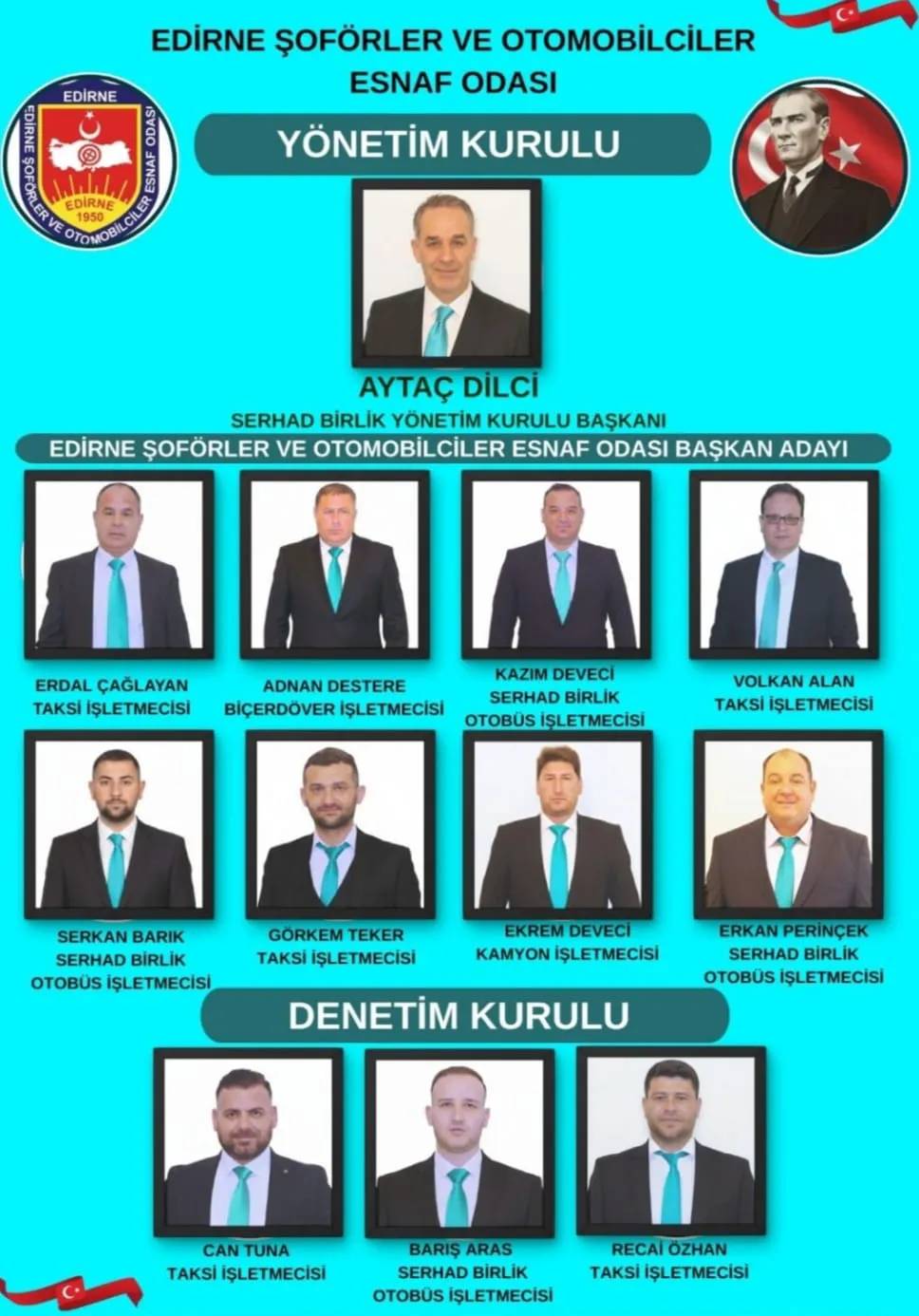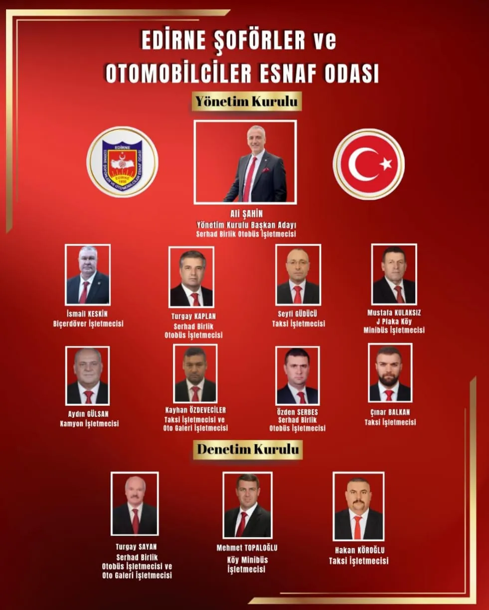 Ali Şahin’in yönetim ve denetim listesinde taksi, minibüs, otobüs ve kamyon işletmecileri ile Serhad Birlik temsilcileri yer alıyor. 18 Ocak 2026’da yapılacak genel kurulda, Edirne Şoförler ve Otomobilciler Esnaf Odası’nı önümüzdeki dönem yönetecek isimler belirlenecek. Seçimin yoğun katılımla geçmesi bekleniyor.