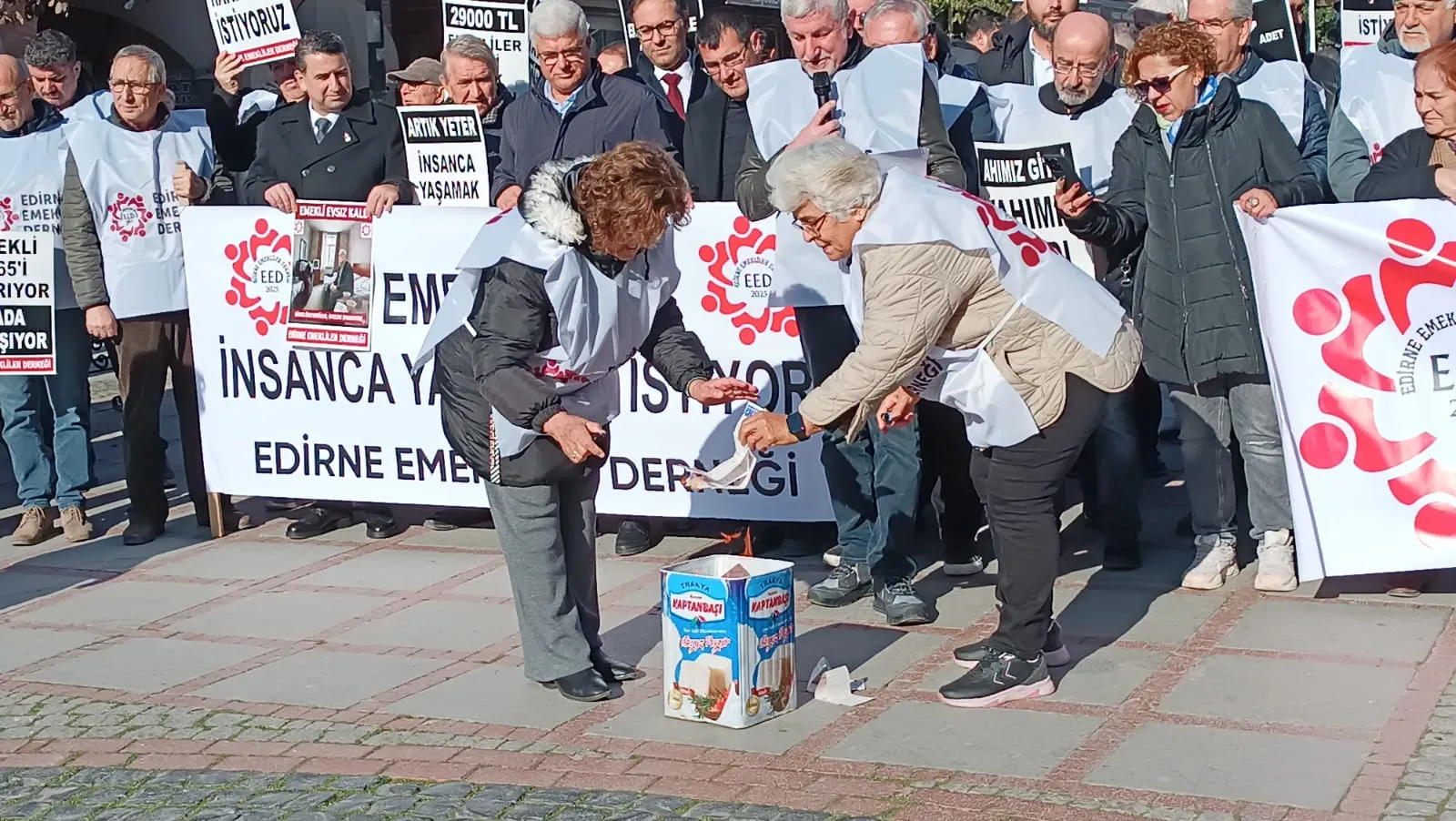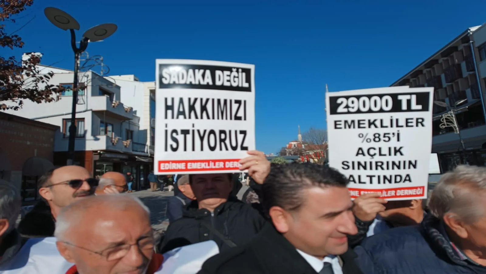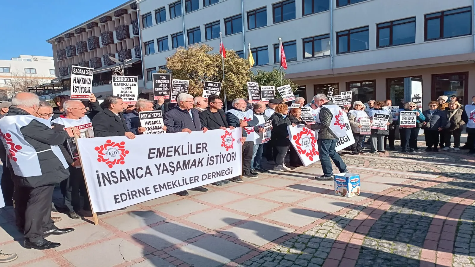Edirne Emekliler Derneği, Saraçlar Caddesi’nde düzenlediği basın açıklamasıyla düşük emekli maaşlarına ve uygulanan ekonomik politikalara sert tepki gösterdi. “Sadaka değil, yıllarca ödediğimiz primlerin karşılığını istiyoruz” sloganıyla gerçekleştirilen açıklamada emeklilerin yaşadığı geçim sıkıntısı kamuoyuna duyuruldu. Açıklamaya çok sayıda emekli ve siyasi parti temsilcisi katıldı.