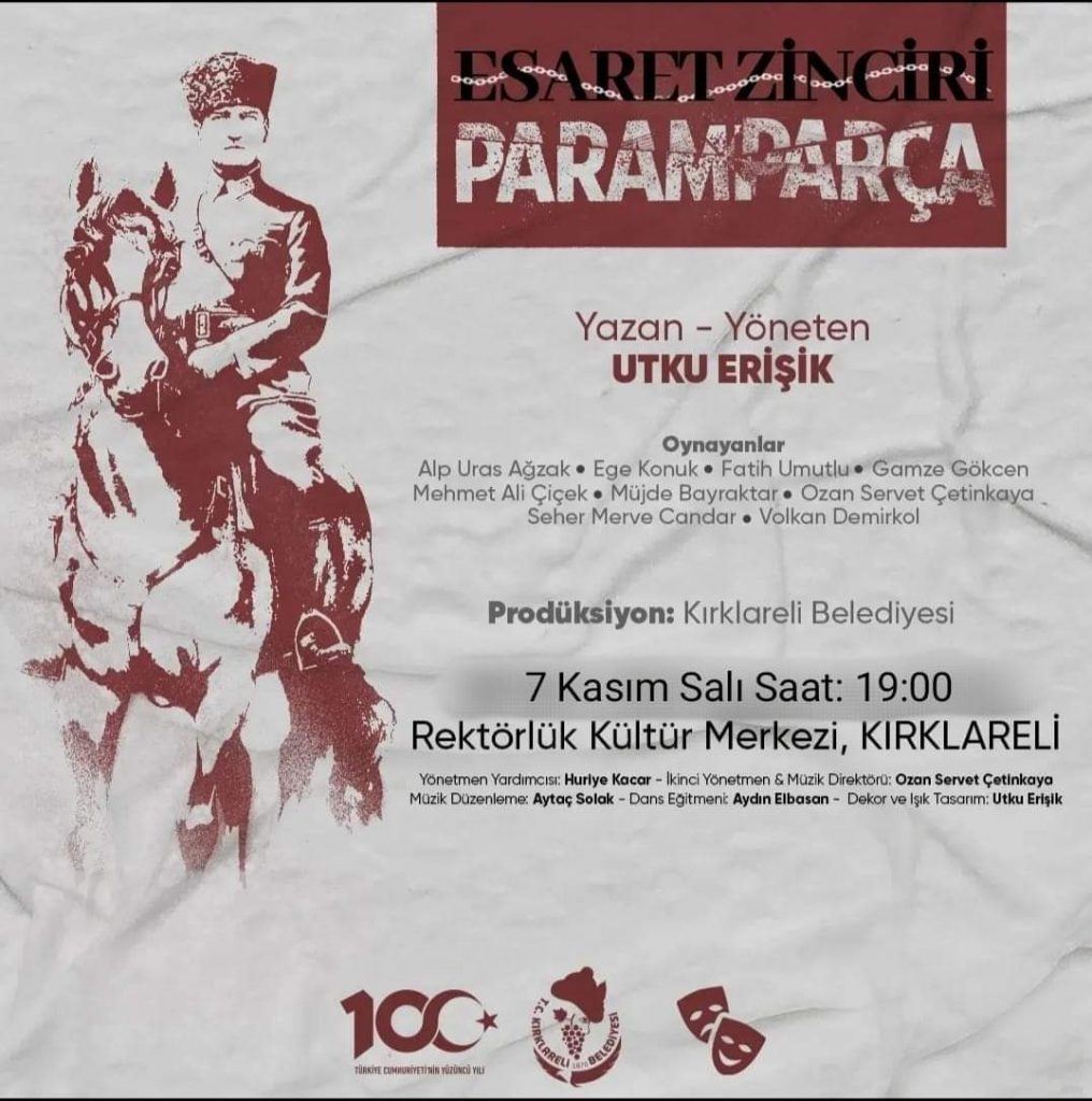 Cumhuriyet’in 100. yılı dolayısıyla, prömiyerini, 28 Ekim’de yine Kırklareli’nde yapan 2 perdelik oyun, ulu önder Mustafa Kemal Atatürk’ün hayatını, oldukça seçkin bir senaryo ve tüm duygularıyla bu esere odaklanmış oyuncuların takdire şayan performansıyla izleyiciye aktarıyor.