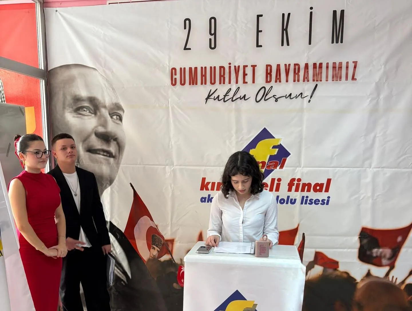 Final Akademi Anadolu Lisesi, Cumhuriyetimizin ilanının 102. yıl dönümünü büyük bir coşku ve gururla kutladı. Okulun kurucusu Ekrem Erdinç, Okul Müdürü Erdem Erdinç, öğretmenler ve öğrencilerin katılımıyla düzenlenen törende, Cumhuriyet’in anlamı bir kez daha vurgulandı. Okul bahçesinde gerçekleşen etkinlikte öğrenciler, ellerinde Türk bayraklarıyla Cumhuriyet sevincini doyasıya yaşadılar.