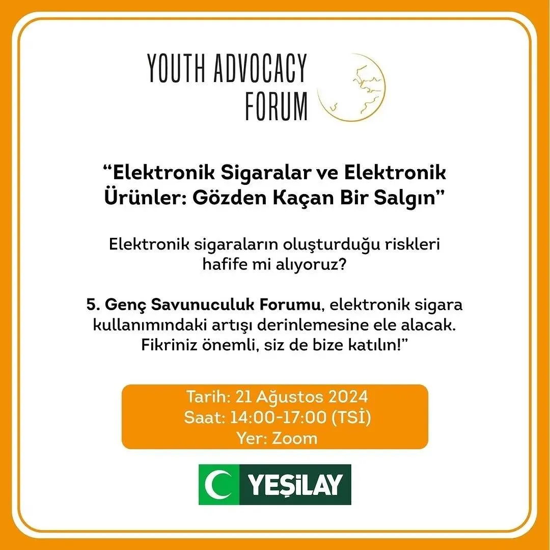 Yeşilay Kırklareli Şubesi tarafından düzenlenen Genç Savunuculuk Forumu, gençlerin bilinçlenmesi ve toplumsal sağlık sorunlarına karşı etkin bir savunuculuk yapabilmeleri için büyük bir fırsat sunuyor. Elektronik sigaraların ve diğer elektronik ürünlerin sağlık üzerindeki etkileri hakkında derinlemesine bilgi edinmek ve bu konuda toplumsal farkındalık oluşturmak isteyen herkesin katılımını bekliyoruz. Bu etkinlik, gençlerin sağlıklı yaşam konusunda bilinçlenmelerine ve toplumsal sorunlara karşı etkili çözümler geliştirmelerine katkı sağlayacak.