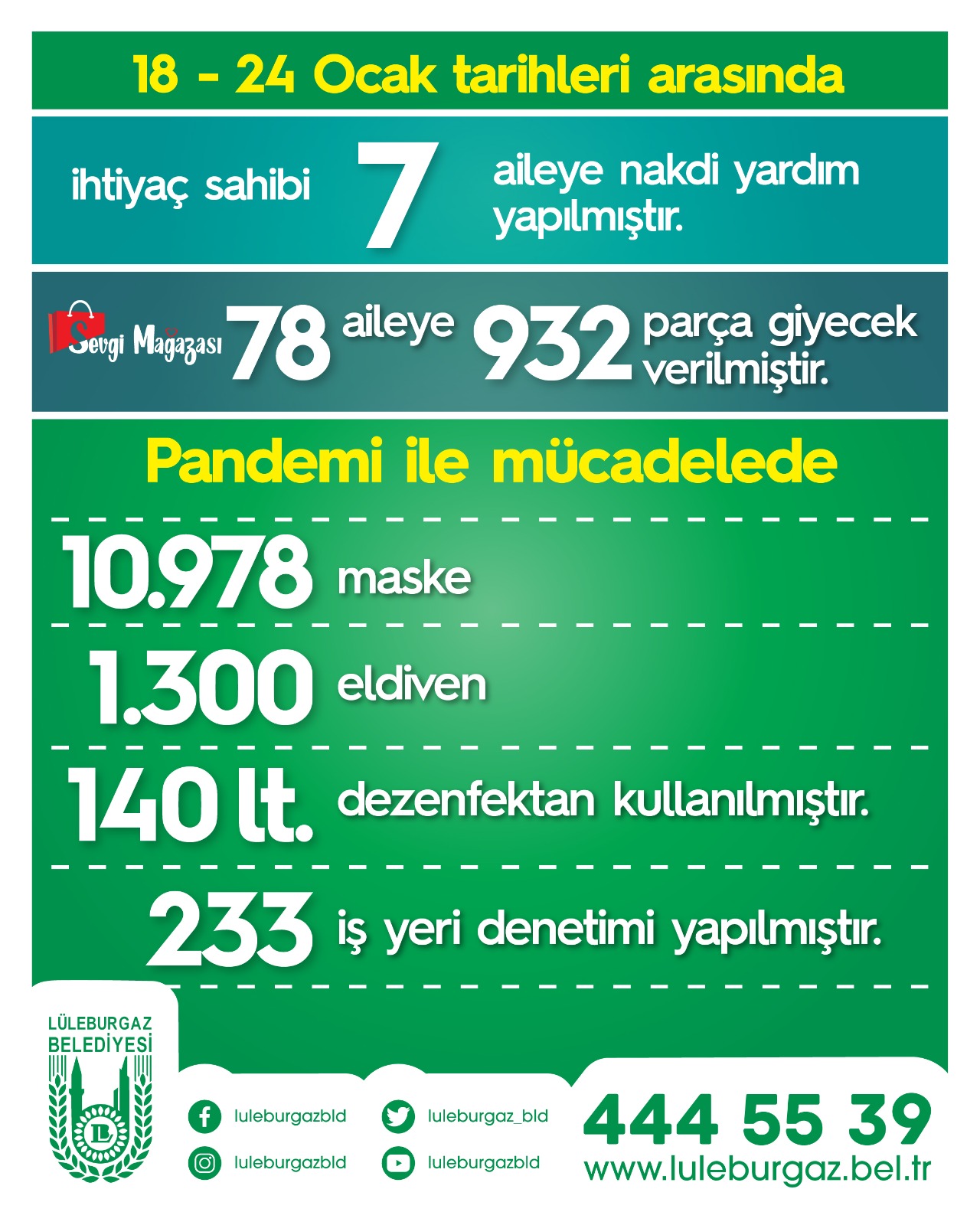 Lüleburgaz Belediyesi’nin şeffaflık ilkesi doğrultusunda yayınladığı “Haftalık Pandemi Raporu” genişletilerek açıklanmaya devam ediyor. Bu kapsamda haftalık pandemi raporunun yanı sıra Sevgi Mağazası ve nakit desteğinde bulunulan vatandaşların da yer aldığı rapor açıklandı. Lüleburgaz Belediyesi’nin her hafta duyurduğu pandemi raporunun 18-22 Ocak tarihleri arasındaki sosyal yardım ve pandemiyle mücadeleyi içeren raporu yayınlandı. Raporda dağıtılan maske ve eldivenlerden nakdi destekte bulunulan aile, dezenfektan kullanımından Sevgi Mağazası’ndan yararlanan aile sayısına kadar çok sayıda veri bulunuyor. 7 aileye daha destek Sosyal Destek Hizmetleri Müdürlüğü’nün her hafta gerçekleştirdiği toplantı sonucunda şartları sağlayan ailelere nakdi destek verilmeye devam ediliyor. 2020 yılında 851 aileye nakit desteğinde bulunan Lüleburgaz Belediyesi geçtiğimiz hafta 7 aileye daha destekte bulundu. Lüleburgaz Belediyesi şartları sağlayan ihtiyaç sahibi vatandaşlara desteğini artırarak devam ettirecek. Öte yandan Sosyal Destek Hizmetleri Müdürlüğü ekipleri geçtiğimiz hafta pazar yerleri, belediye hizmet binası ve tesislerde toplam 10 bin 978 adet maske dağıttı. Tüm bunlarla birlikte Sosyal Destek Hizmetleri ile Temizlik ve Çevre Müdürlüğü ekipleri toplam 140 litre dezenfektan kullandı. 233 iş yerine denetim Tüm bunlarla birlikte Zabıta Müdürlüğü ekipleri de korona virüs kapsamındaki denetimlerine aralıksız devam etti. Bu kapsamda geçtiğimiz hafta boyunca toplam 233 iş yerine denetim gerçekleştirildi. Kurallara uymayan iş yerlerine işlem yapıldı. 78 aileye 932 parça giyecek Öte yandan geçtiğimiz hafta törenle açılan Sevgi Mağazası’ndan ise bir haftada 78 ihtiyaç sahibi aile faydalandı. İhtiyaç sahibi 78 aile toplam 932 parça giyecek alarak Sevgi Mağazası’ndan yararlandı.