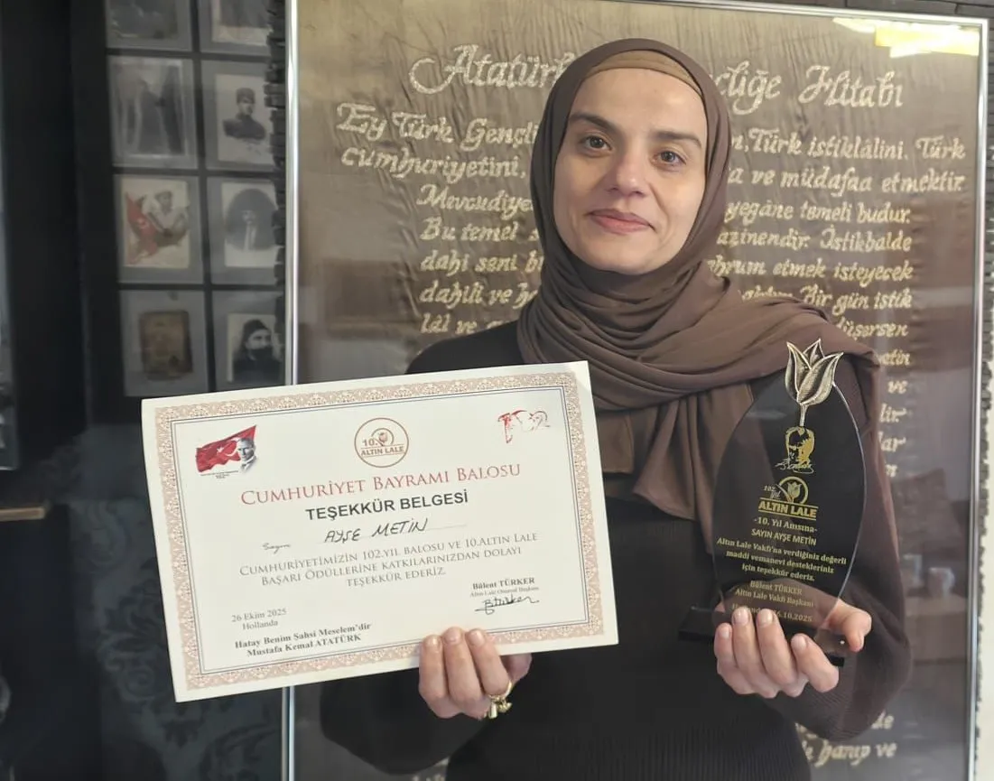 Rotterdam’da yaşayan ve birçok sivil toplum kuruluşunda gönüllü çalışmalarıyla tanınan hayırsever Ayşe Metin, 6 Şubat depremlerinin ardından depremzedelere sunduğu maddi ve manevi destekler nedeniyle Altın Lale Vakfı tarafından ödüle layık görüldü. Toplumsal duyarlılığı ve gönüllere dokunan çalışmalarıyla öne çıkan Metin’e ödülü, Hollanda Atatürk Müzesi’nde düzenlenen özel bir törenle takdim edildi.