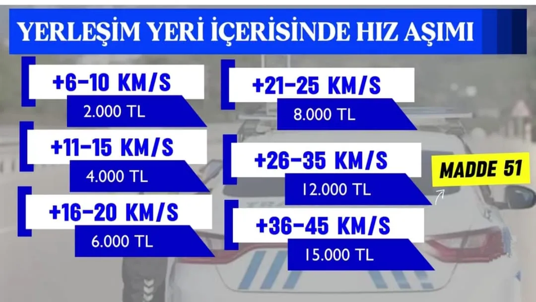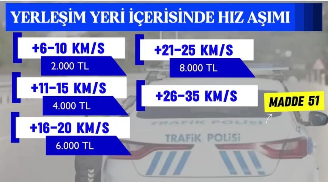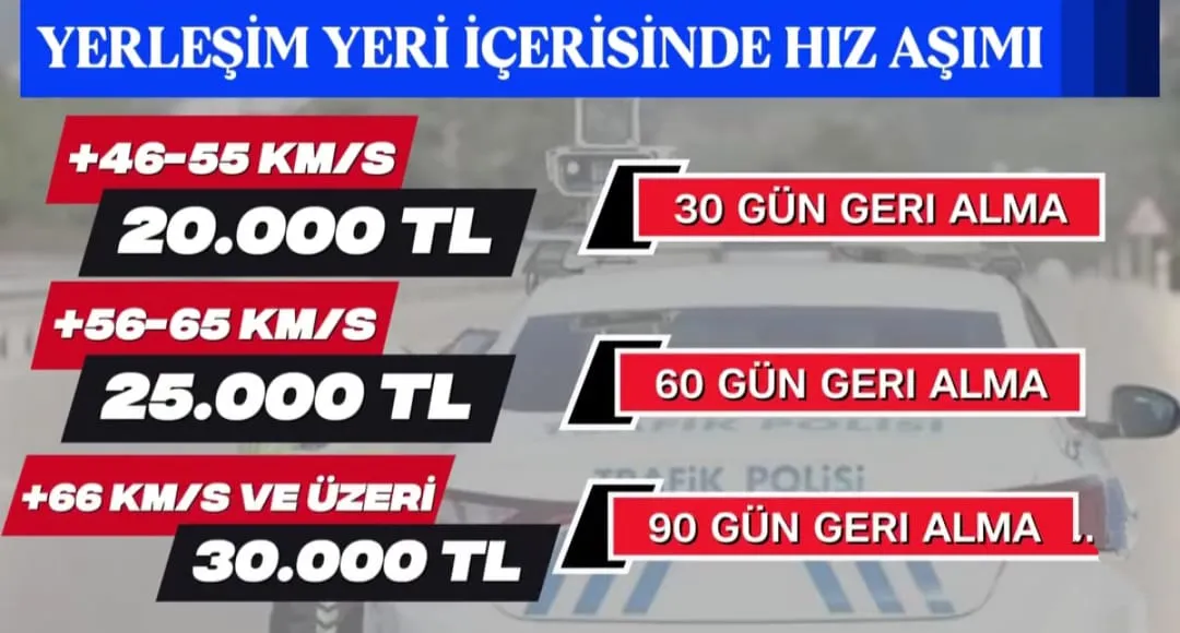 Yeni uygulamada özellikle yüksek hız ihlallerine karşı daha sert yaptırımlar getiriliyor. Yerleşim yeri içerisinde hız sınırının 46 kilometre ve üzerinde aşılması durumunda sürücülere 20 bin TL’den başlayan para cezaları uygulanacak.