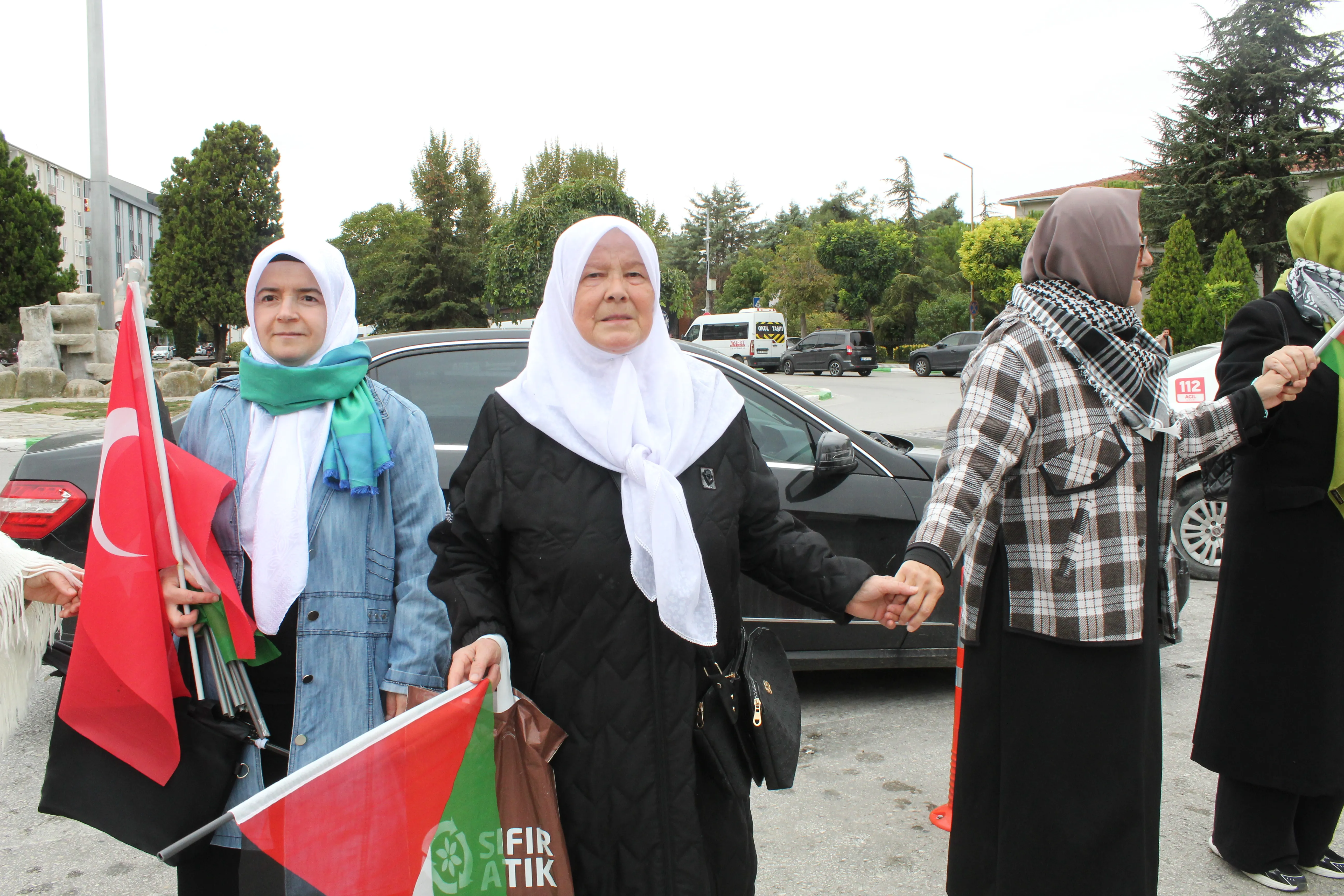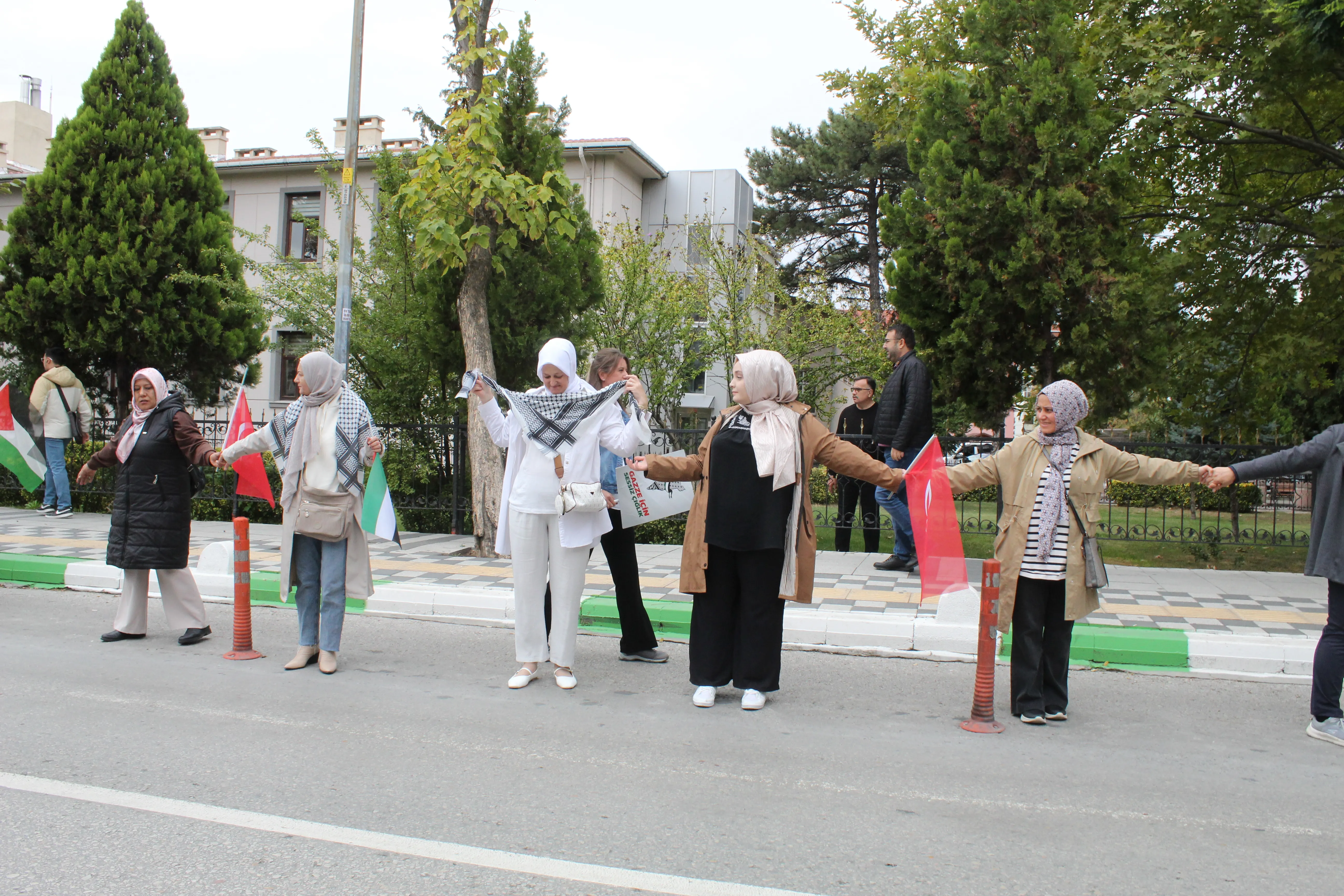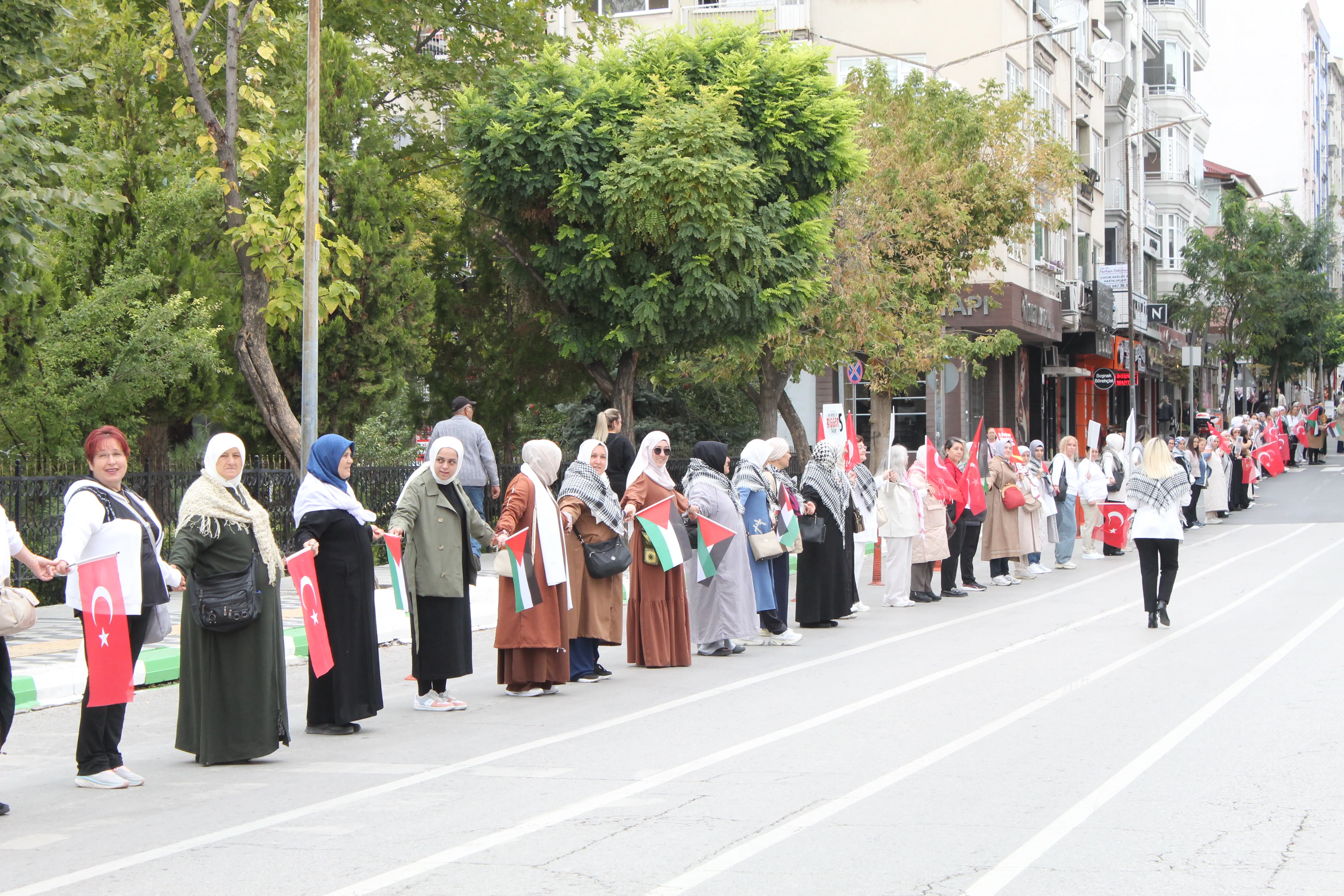 Kadın Kolları Başkanı Canan Genim, etkinlikte yaptığı konuşmada, “Bugün kadınlar olarak Gazze’nin sessiz çığlığına ses olmak için el ele verdik. Bu zincir, Gazze’de evlatlarını kaybeden anne-babaların zinciridir. Öksüz ve yetim bırakılan çocukların zinciridir. İnsanlığını kaybetmeyen herkesin zinciridir.” ifadelerini kullandı.