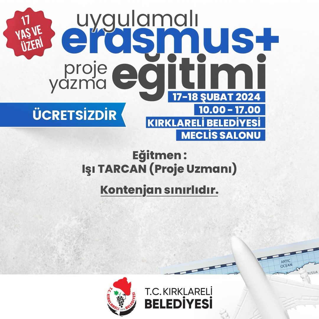 Kırklareli Belediyesi uzman eğitmenlerle birlikte uygulamalı erasmus+ proje yazma eğitimi verecek.