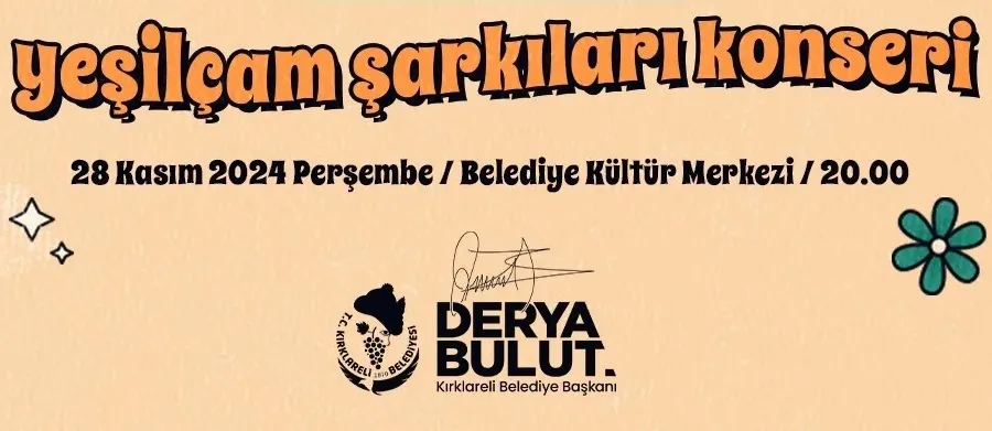 Kırklareli Belediyesi, kültür ve sanat dünyasında bir yeniliğe daha imza atarak, 28 Kasım 2024 Perşembe günü Yeşilçam Şarkıları Konseri düzenleyecek. Kırklareli Belediye Kültür Merkezi’nde saat 20:00’de başlayacak olan konser, Türk Sineması'nın altın dönemini temsil eden unutulmaz şarkıların seslendirileceği nostaljik bir geceye ev sahipliği yapacak. Bu etkinlik, özellikle Yeşilçam Dönemi şarkıları ve film müziklerini sevenler için kaçırılmayacak bir fırsat sunuyor.