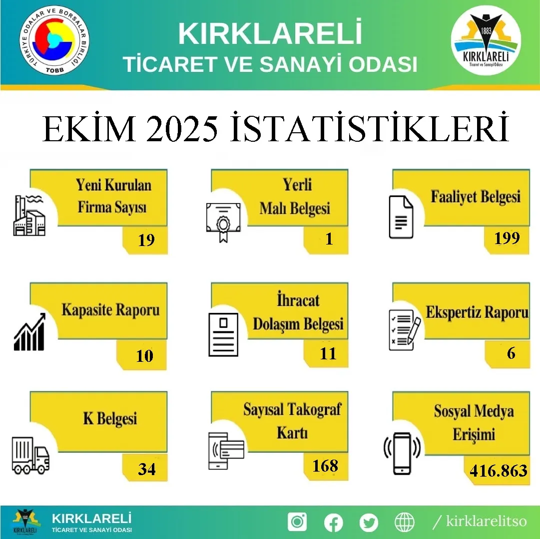 Kırklareli TSO, Ekim ayında üyelerine yönelik çeşitli belge düzenleme ve danışmanlık hizmetlerini sürdürdü. Açıklamaya göre, 1 adet Yerli Malı Belgesi, 199 adet Faaliyet Belgesi, 10 adet Kapasite Raporu, 11 adet İhracat Dolaşım Belgesi, 6 adet Ekspertiz Raporu, 34 adet K Belgesi ve 168 adet Sayısal Takograf Kartı verildi. Bu rakamlar, kentin sanayi ve ticaret alanındaki aktif üretim ve lojistik kapasitesini ortaya koydu.