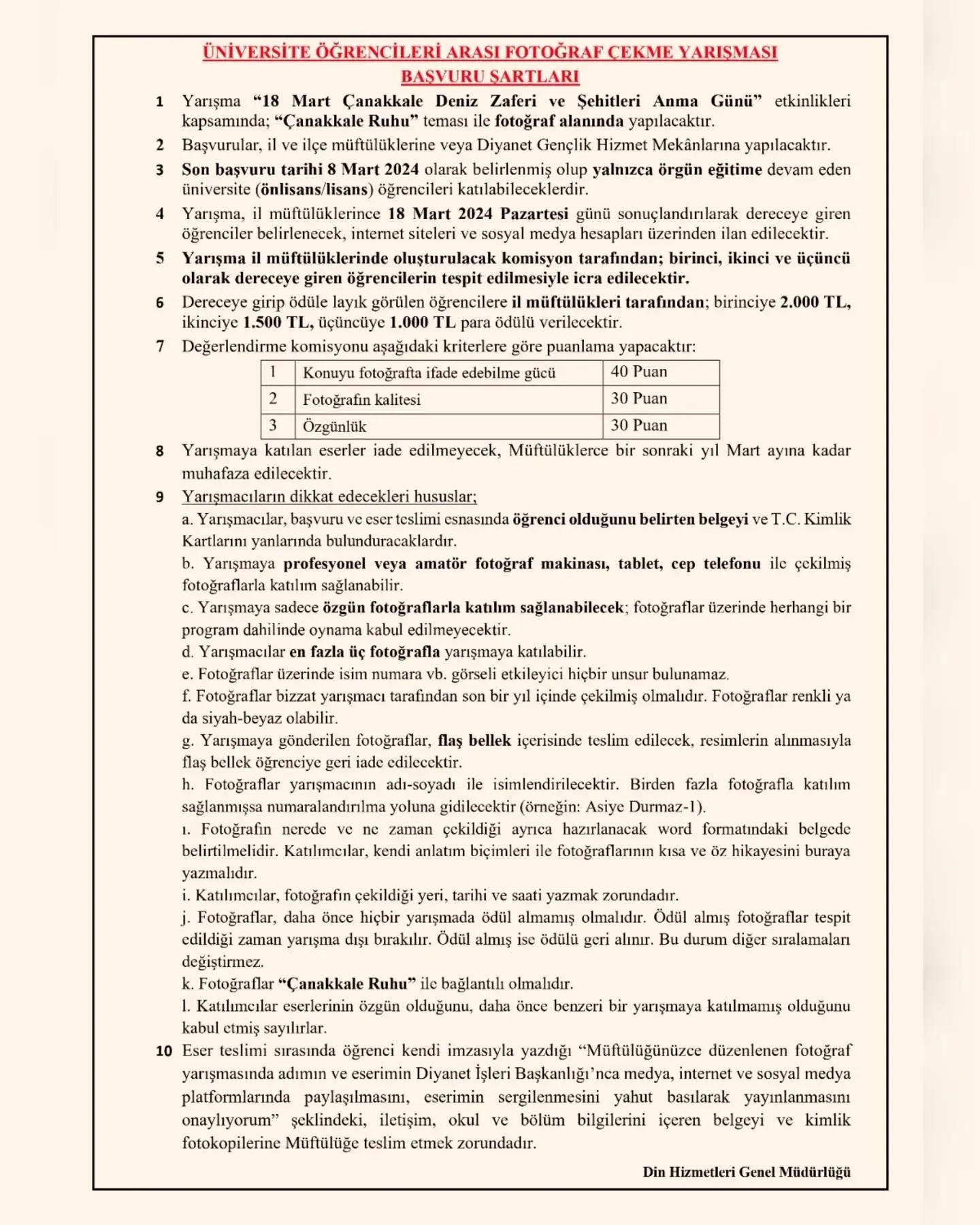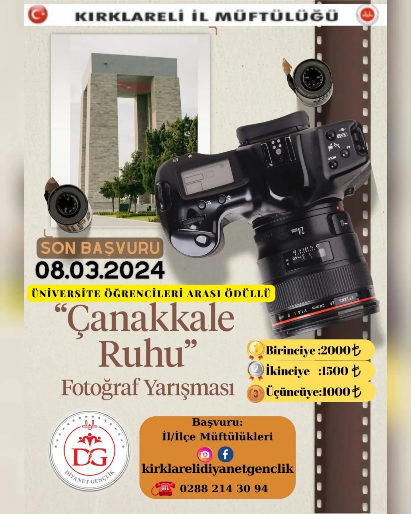 Kırklareli İl Müftülüğü, 18 Mart Çanakkale Deniz Zaferi ve Şehitleri Anma Günü kapsamında üniversite öğrencilerine özel bir fotoğraf yarışması düzenliyor. "Çanakkale Ruhu" temasıyla gerçekleşecek olan yarışmaya katılan öğrenciler, 2.000 TL'lik birinci ödül, 1.500 TL'lik ikinci ödül ve 1.000 TL'lik üçüncü ödül şansı elde edecekler.