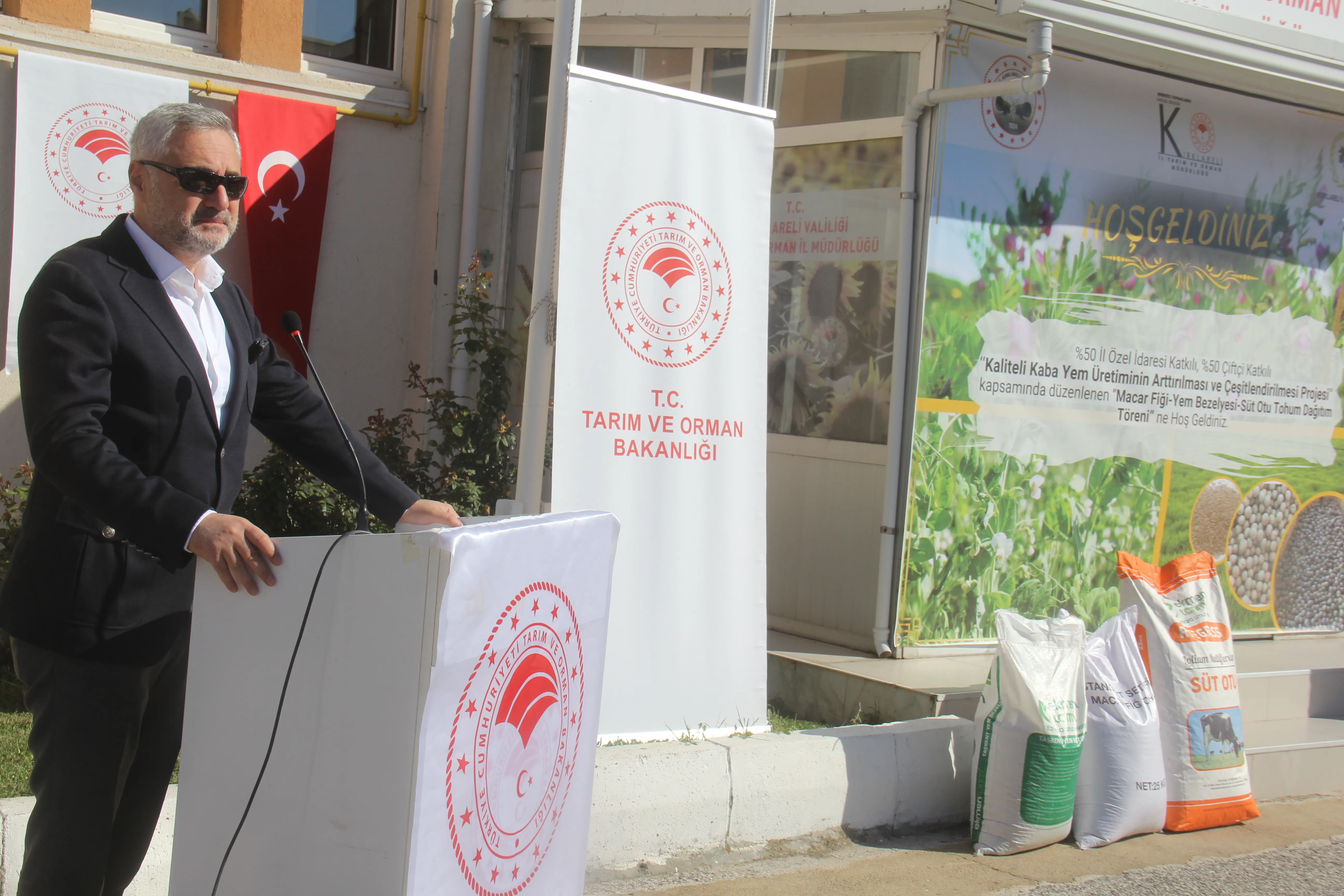 Kırklareli Valisi Uğur Turan, törende yaptığı konuşmada iklim değişikliğinin tarım ve hayvancılığı tehdit ettiğine dikkat çekti. Tohum desteğinin sadece toprağa atılan bir tohum değil, hayvancılığın geleceğine atılan güçlü bir adım olduğunu belirten Turan, “Kaba yem olmadan süt verimi düşer, et kalitesi azalır, hayvan hastalıkları artar. Bu nedenle dağıttığımız kuraklığa dayanıklı yem bitkileri, çiftçimize nefes aldıracak.” dedi. Turan, Macar fiğ, yem bezelyesi ve süt otunun dekar başına 5 ila 7 ton verim potansiyeline sahip olduğunu vurgulayarak, “Bu proje sayesinde hem verim artacak hem de hayvancılığımız daha güçlü bir yapıya kavuşacak.” ifadelerini kullandı.