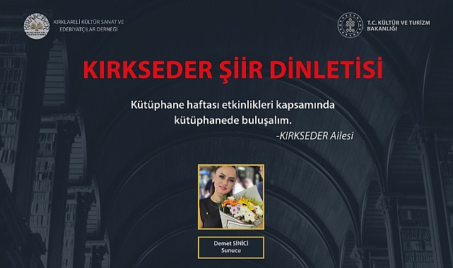Kırklareli İl Halk Kütüphanesi Müdürlüğü, Kütüphane Haftası etkinlikleri kapsamında edebiyatseverleri özel bir şiir dinletisine davet ediyor. Kırklareli Kültür Sanat ve Edebiyatçılar Derneği (KIRKSEDER) üyesi şairler, 1 Nisan Çarşamba günü saat 20.00’de düzenlenecek etkinlikte sahne alacak. Sunuculuğunu deneyimli sanatçı Demet Sinici’nin üstleneceği program, Kırklareli’de kültür ve sanat tutkunları için unutulmaz bir gece vaat ediyor.