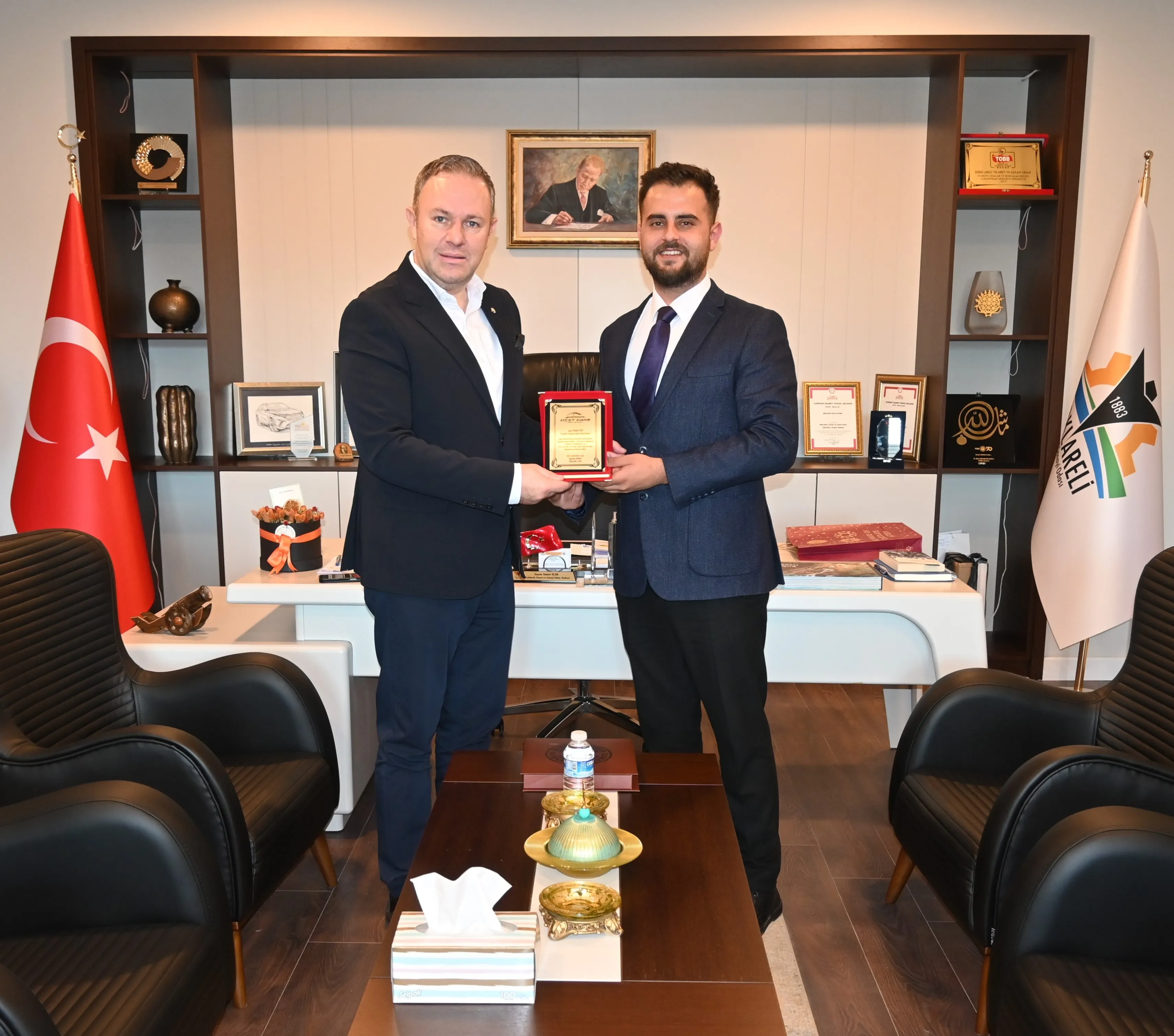 Kırklareli TSO Başkanı Soner Ilık, ayrıca Ozzy Cars Araç Kiralama sahibi Oğuzhan Gürbay’ı yeni hizmet binasında ağırladı. Gürbay, yeni binanın Kırklareli iş camiasına hayırlı olması dileklerini ileterek, Ilık’a bir hediye takdim etti. Başkan Ilık, “Ziyaretiniz ve güzel temennileriniz bizleri çok mutlu etti. Birlikte çalışarak Kırklareli’yi her alanda daha güçlü bir konuma taşımak en büyük hedefimiz.” dedi.