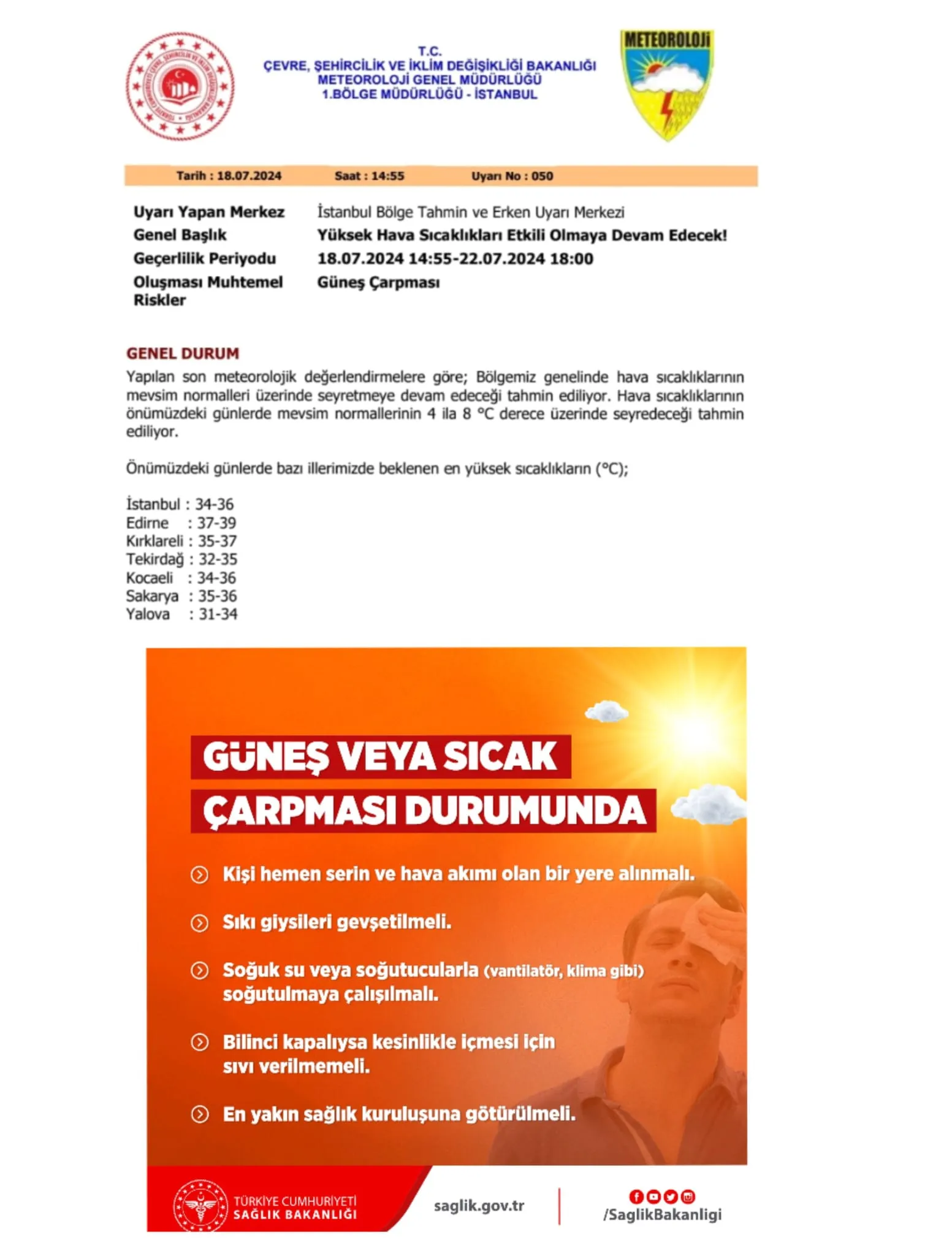 Bölge genelinde hissedilecek yüksek sıcaklıkların özellikle Güneş çarpması riskini artırdığı belirtildi. Bu bağlamda, kronik rahatsızlığı olanlar, yaşlılar ve çocukların 11.00 ile 16.00 saatleri arasında açık alanlarda bulunmamaları konusunda uyarıda bulunuldu. Yüksek sıcaklıkların etkisini en aza indirmek için gölgede kalmanın, bol su tüketmenin ve serin yerlerde bulunmanın önemi bir kez daha hatırlatıldı.