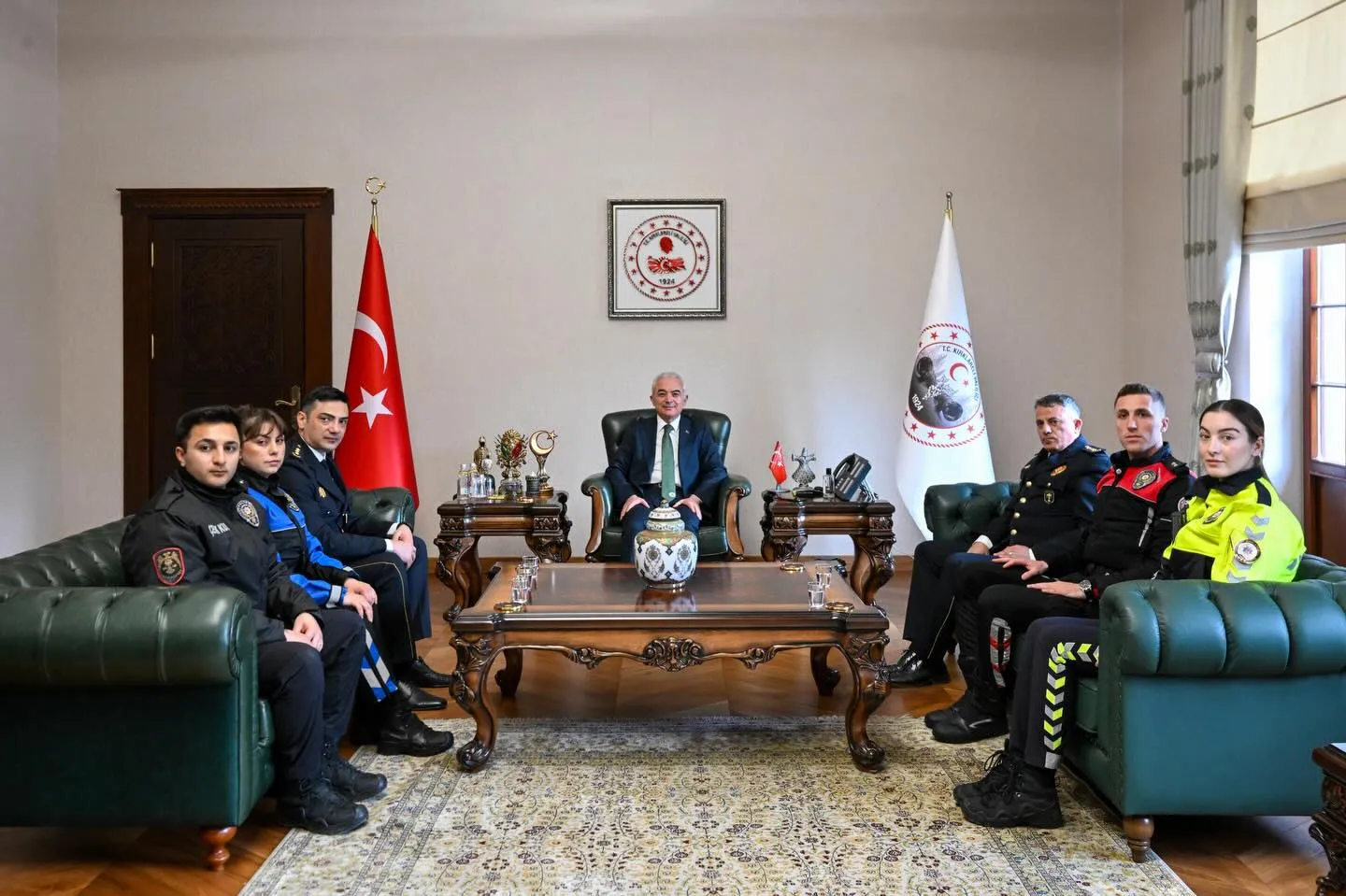 Kırklareli Valisi Uğur Turan, Türk Polis Teşkilatı’nın 181. kuruluş yıl dönümü ve Polis Haftası dolayısıyla emniyet Müdürü Sinan Çamuroğlu"> İl Emniyet Müdürü Sinan Çamuroğlu ve beraberindeki heyeti Valilik makamında kabul etti. Gerçekleştirilen ziyaret, anlamlı mesajların verildiği özel bir buluşmaya sahne oldu.