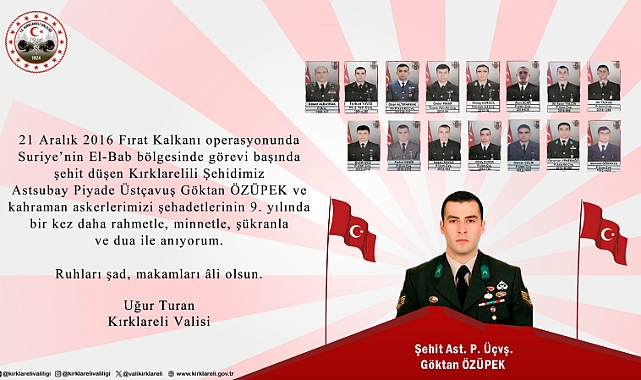 Kırklareli Valisi Uğur Turan, 21 Aralık 2016 tarihinde Fırat Kalkanı Harekâtı kapsamında Suriye’nin El-Bab bölgesinde görevi başında şehit düşen Astsubay Piyade Üstçavuş Göktan Özüpek ve tüm kahraman şehitler için anlamlı bir anma mesajı yayımladı. Vali Turan, şehadetlerinin 9. yılında Şehit Göktan Özüpek ve tüm şehitleri rahmet, minnet ve dualarla andı.