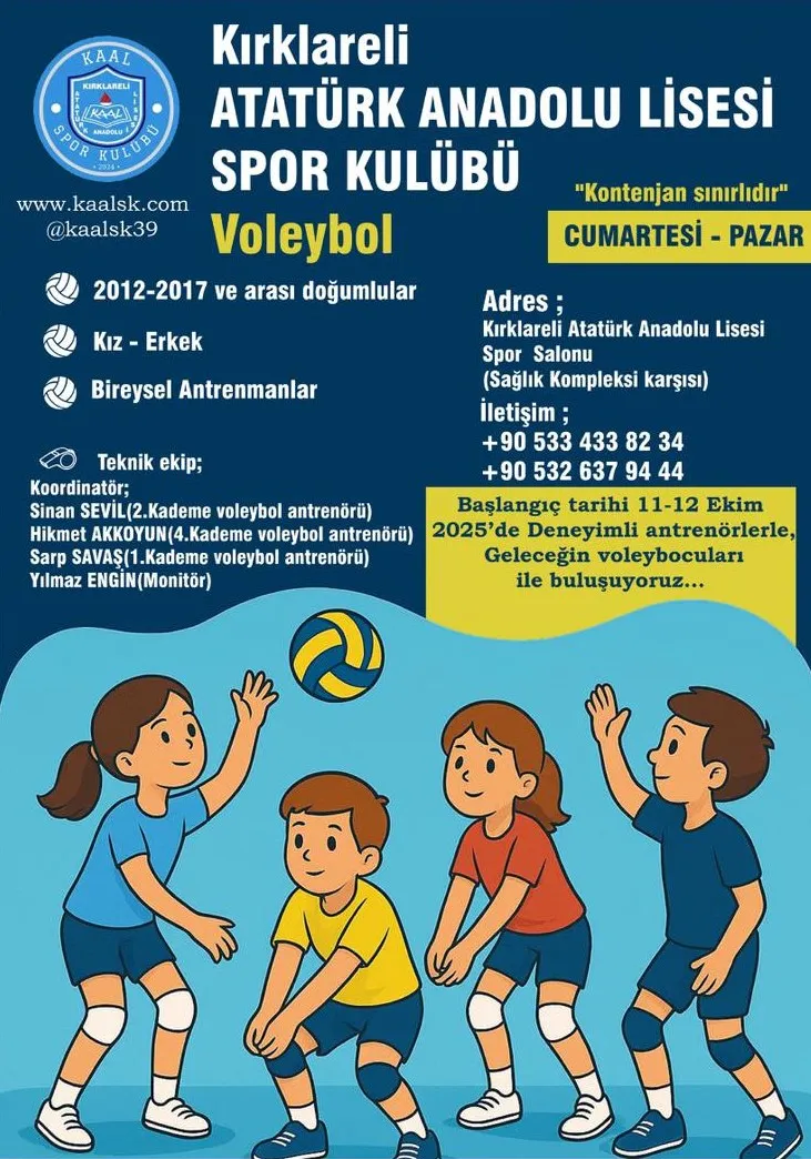 Kırklareli Atatürk Anadolu Lisesi Spor Kulübü, yeni dönemde voleybol branşında yetenekli çocukları keşfetmek ve geleceğin yıldız sporcularını yetiştirmek için kayıtlarını başlattı. Uzman antrenör kadrosu ile çalışmalarını sürdüren kulüp, hiçbir çocuğun yeteneğinin heba edilmesine izin vermeyecek.