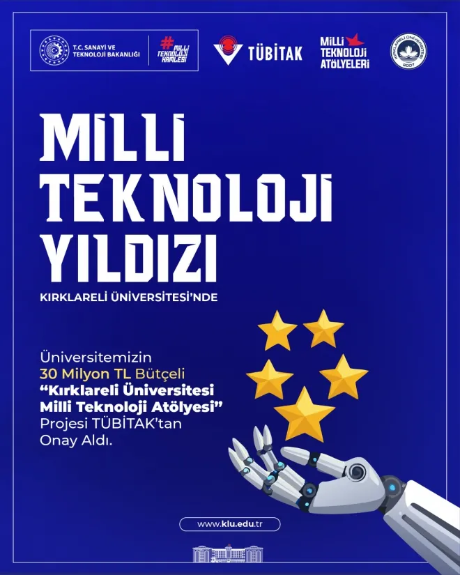 Kırklareli Üniversitesi (KLÜ) öğretim üyeleri tarafından hazırlanan “Kırklareli Üniversitesi Milli Teknoloji Atölyesi” projesi, TÜBİTAK tarafından desteklenmeye hak kazandı. Toplam 30 milyon TL’lik bütçesi ile dikkat çeken proje, Türkiye’nin Milli Teknoloji Hamlesi hedeflerine bölgesel düzeyde güçlü katkı sağlamayı amaçlıyor.