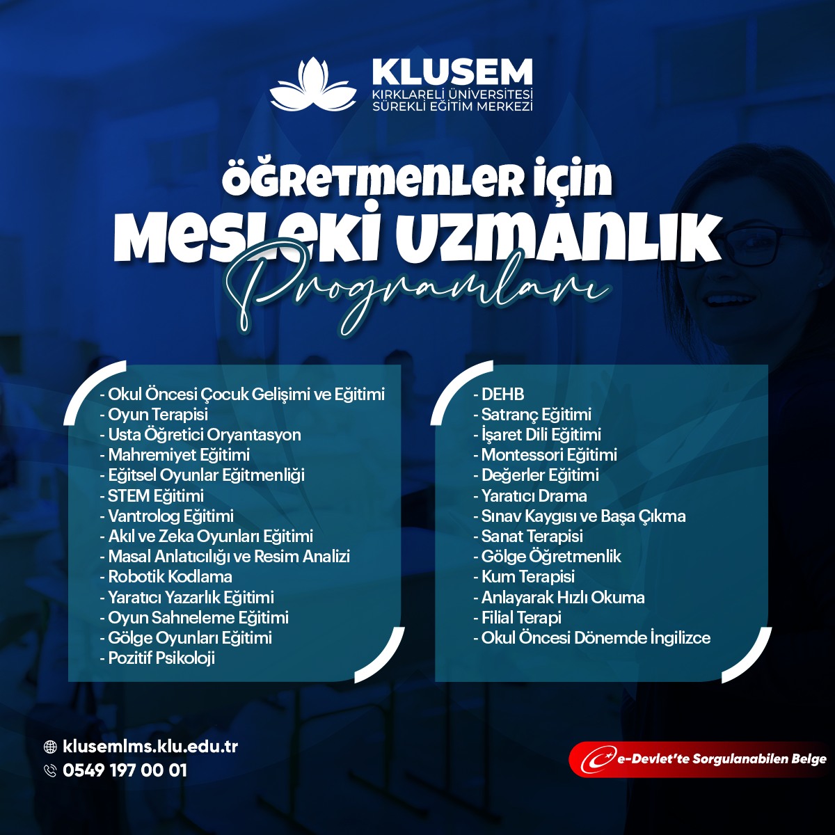 Kırklareli Üniversitesi Sürekli Eğitim Merkezi (KLUSEM) tarafından öğretmenlere yönelik uzmanlık programı hayata geçirilecek.Program ile ilgili yayınlanan bilgilendirmede; “Öğretmenler için mesleki uzmanlık programları, öğretmenlerin pedagojik becerilerini geliştirmek, öğrencilerin öğrenme deneyimlerini iyileştirmek ve mesleki uzmanlık alanlarında derinleşmek için tasarlanmış eğitim programlarıdır.Bu programlar, öğretmenlere yeni öğretim yöntemleri, müfredat geliştirme, sınıf yönetimi, öğrenci değerlendirmesi ve öğrencilerin farklı öğrenme ihtiyaçlarına uyum sağlama konularında bilgi ve beceriler kazandırmayı hedefler.Eğitim hakkında bilgi almak ve katılım sağlamak için profilde yer alan biyografi linkine tıklayarak arama çubuğuna ilgili eğitimin ismini aratabilir veya bize mesaj yoluyla ulaşabilirsiniz” ifadeleri kullanıldı. (Şenol Goncagül)
