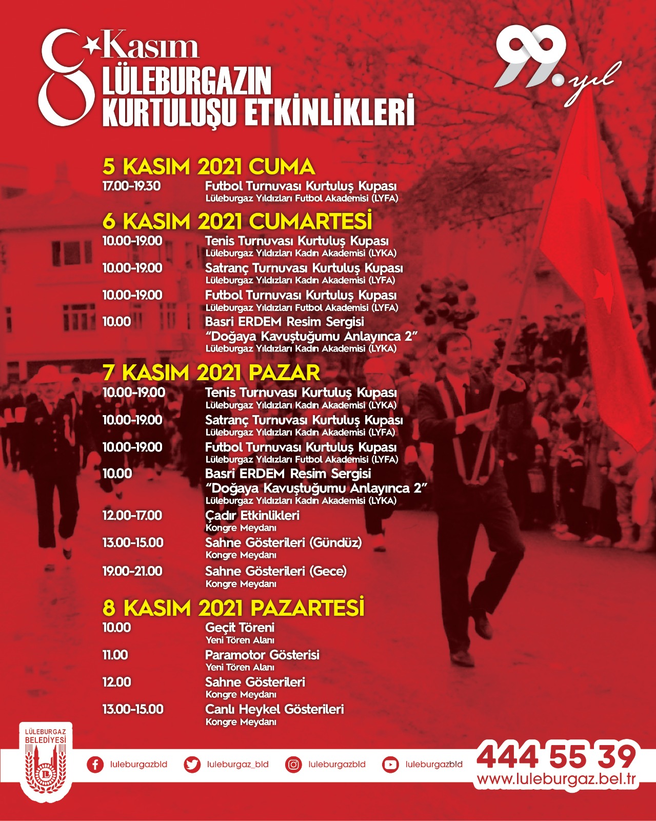 Lüleburgaz Belediyesi, Lüleburgaz’ın düşman işgalinden kurtuluşunun 99’uncu yıl dönümü kapsamında dolu dolu etkinlik programı hazırladı. 5 Kasım Cuma günü LYFA’da Futbol Turnuvası Kurtuluş Kupası’yla başlayacak etkinlikler kurtuluşun günü 8 Kasım’a kadar sürecek. Bu kapsamda tenis, satranç, futbol turnuvalarından resim sergisine, canlı heykel gösterilerinden paramotor gösterisine kadar çok sayıda etkinlik gerçekleştirilecek.