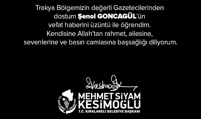 Kesimoğlu Mesajında ; Trakya Bölgemizin değerli gazetecilerinden dostum Şenol Goncagül'ün vefat haberini üzüntüyle öğrendim. Kendisine Allah'tan rahmet, ailesine, sevenlerine ve basın camiasına başsağlığı diliyorum'' dedi.