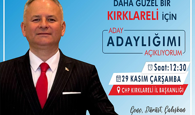 Başkan Serdar Türker Sosyal Medya Hesabı üzerinden yaptığı açıklamada Kırklareli Belediye Başkanlığına aday adayı olduğunu söyledi. Serdar Türker aday adaylığı açıklamasını 29 Kasım 2023 Çarşamba günü saat 12.30’da Cumhuriyet Halk Partisi Kırklareli İl Başkanlığı binasında yapacağını aktardı.