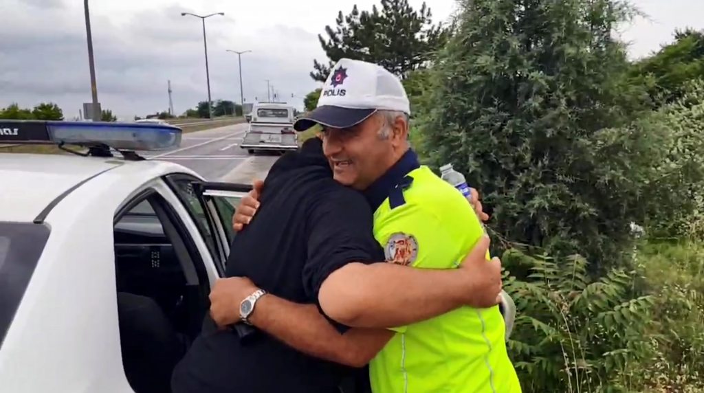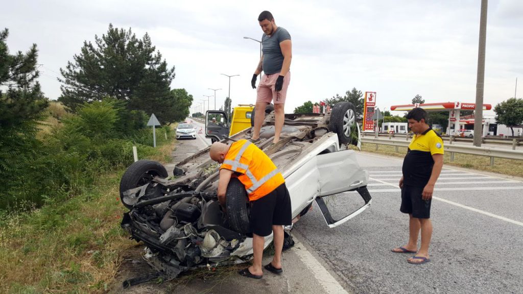 EDİRNE'de takla atıp ters dönen otomobilde sıkışan sürücü Muhammed İş’i trafik polisleri çıkardı. İş, kendisini kurtaran polis memurlarına sarılarak teşekkür etti.Kaza, Edirne - Kapıkule yolu üzerinde meydana geldi. İstanbul'dan Bulgaristan'a giden Muhammed İş’in kullandığı X 1796 MA plakalı otomobil, sürücüsünün kontrolünü yitirmesiyle takla atıp, yol kenarındaki çalılılıklar arasında ters döndü. Kazayı görenlerin ihbarıyla bölgeye polis ve sağlık ekipleri sevk edildi. Kaza yerine ilk ulaşan trafik polisleri, otomobilin sürücü koltuğunda sıkışan İş’i çıkardı.Kazadan yara almadan kurtulan Muhammed İş, ilk şoku atlattıktan sonra kendisine yardım ederek araçtan çıkaran polislere sarılarak teşekkür etti. Telefona baktığı için direksiyon hakimiyetini kaybettiğini söyleyen İş, "Bir an telefonla ilgilendim ve direksiyon hakimiyetini kaybettim. Sonrasında 3-4 takla atıp buraya geldim. Çok şükür ki bir şey olmadı. Araba gitti ama bize bir şey olmadı. Yardım için gelenler araçtan beni kurtardı. Sağ kurtulduğum için çok mutluyum" dedi.(DHA)