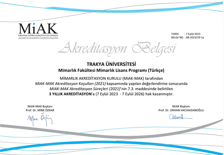 Mimarlık eğitiminin akreditasyon koşullarının belirlenmesi ve değerlendirme süreçlerinin yürütülmesinden sorumlu olan MiAK-MAK’a yapılan başvuru ve ardından alanında uzman ekip tarafından gerçekleştirilen denetimler sonucunda Mimarlık Bölümü akredite oldu. Bu kapsamda, Trakya Üniversitesi Mimarlık Fakültesi Mimarlık Bölümü, uluslararası ortamda sahip olduğu saygınlığı, ulusal akreditasyon başarısıyla da perçinlemiş oldu.
