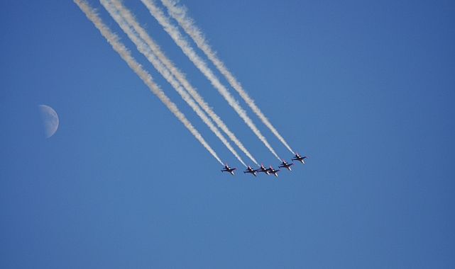 Türk Yıldızları, gösterilerinin finalinde gökyüzüne bıraktıkları kalp figürüyle Cumhuriyet’in sevgi, barış ve kardeşlik mesajını simgeledi. Seyirciler bu anlamlı hareketi uzun süre alkışladı. Devlet Su İşleri (DSİ) Sosyal Tesisleri’nde toplanan yüzlerce vatandaş, gösteriyi büyük bir ilgiyle takip etti.