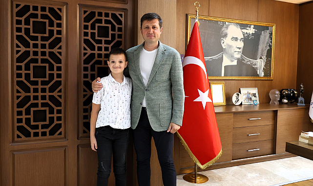 Ziyaretin ardından Belediye Başkanımız Vahap Akay tarafından Türkiye birincisi Sertuğ Mutlu’ya hediye takdim edildi ve günün anısına hatıra fotoğrafı çekildi.