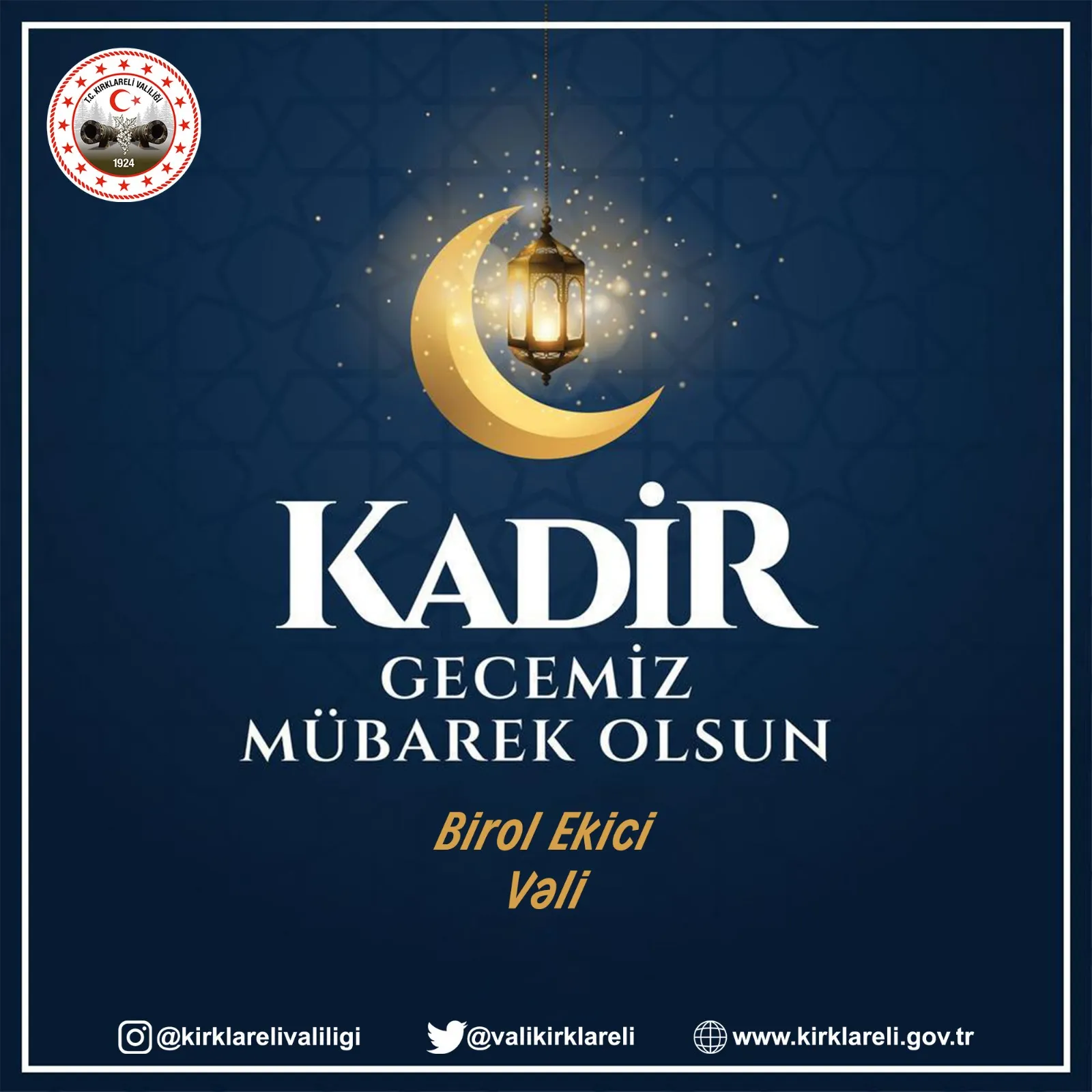 Vali Ekici ayrıca, bu kutlu gecenin tüm yurdumuzu, milletimizi ve insanlığı esenlikle doldurması, dünyada barış ve huzurun artması, mazlum milletlerin acılarının son bulması için bir vesile olmasını temenni etti. Bin aydan daha hayırlı olan Kadir Gecesi'nin İslam âlemi ve tüm insanlık için hayırlara vesile olmasını dileyen Vali Ekici, tüm Kırklarelili hemşerilerinin Kadir Gecesini tebrik ederek; “On bir ayın sultanı mübarek Ramazan ayının sonuna doğru yaklaşırken nice hayır ve güzellikleri bünyesinde barındıran bir Kadir Gecesi’ne daha kavuşmanın huzurunu hep birlikte yaşıyoruz.
